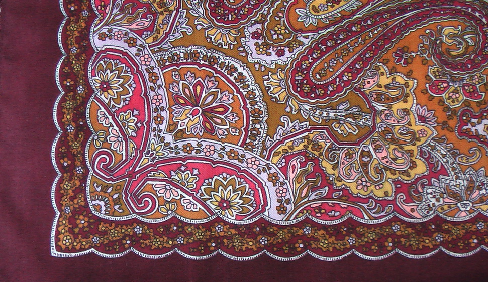 Показываю "Караван". Фотографировала без вспышки в солнечный день. Мне шаль очень понравилась, смотрите сами... Также показываю в сравнении с другими платками красно-бордовых тонов.На крупных фрагментах, на мой взгляд цвета соответствуют оригиналу.