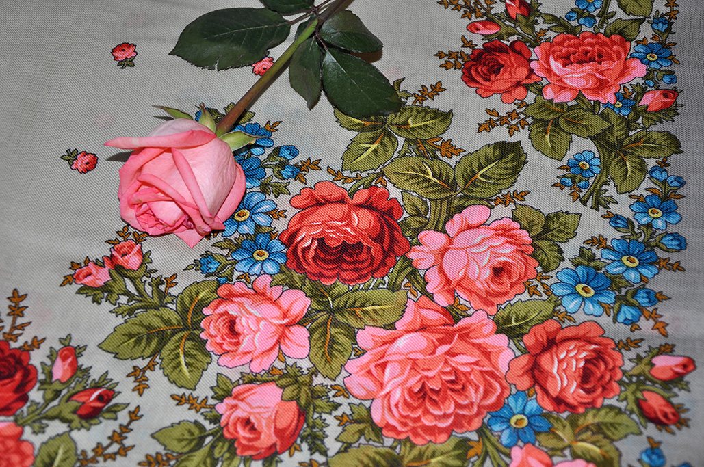 И последнее, что просто не могу вам не показать. Сегодня я получила еще и множество платочков для моих швейных изысков ( ;) ), в том числе, Вареньку. Не буду сравнивать между собой разные колориты (хотя у меня их три), а сравню цвет роз на серо-зеленом платочке с реальной розочкой.