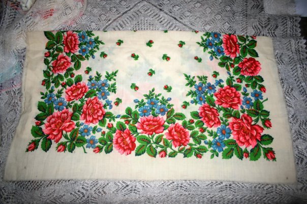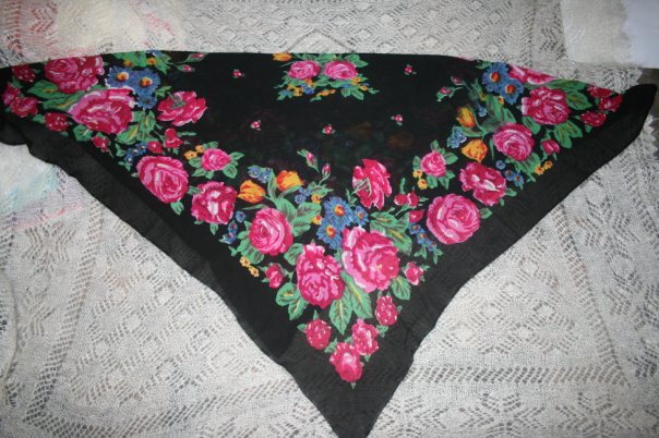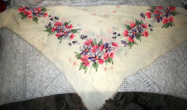 Практически наверняка павловопосадские - шаль, белый шерстяной и хлопчатобумажный платки. У шали чудесный рисунок - люблю такие живые цветы. Отдельное спасибо - за крупную ее фотографию ^% ^% ^% : вся красота видна.