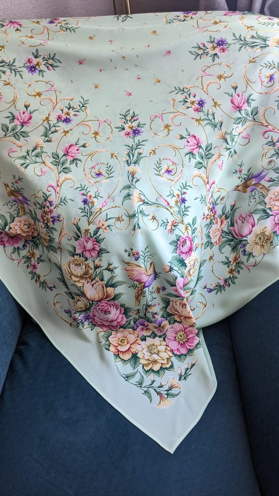 Сегодня пришлось фотографировать в другой комнате с кондиционером, поэтому появились фото на кресле. Там самая точная цветопередача. Серединка шали не голубая ^a , но телефон упорно врёт.