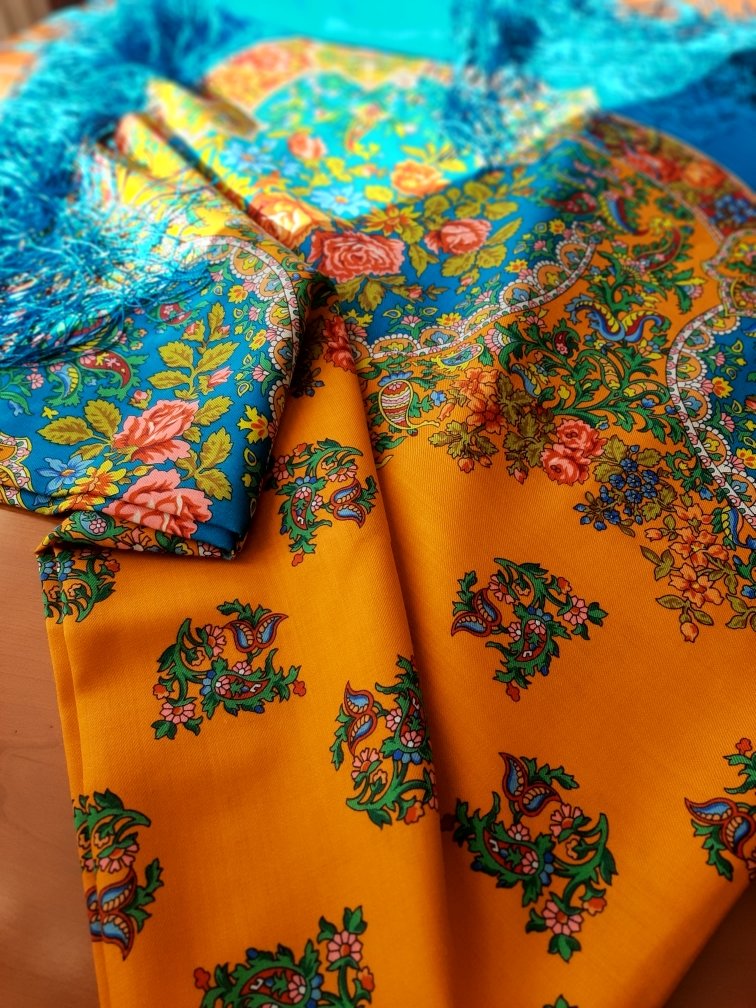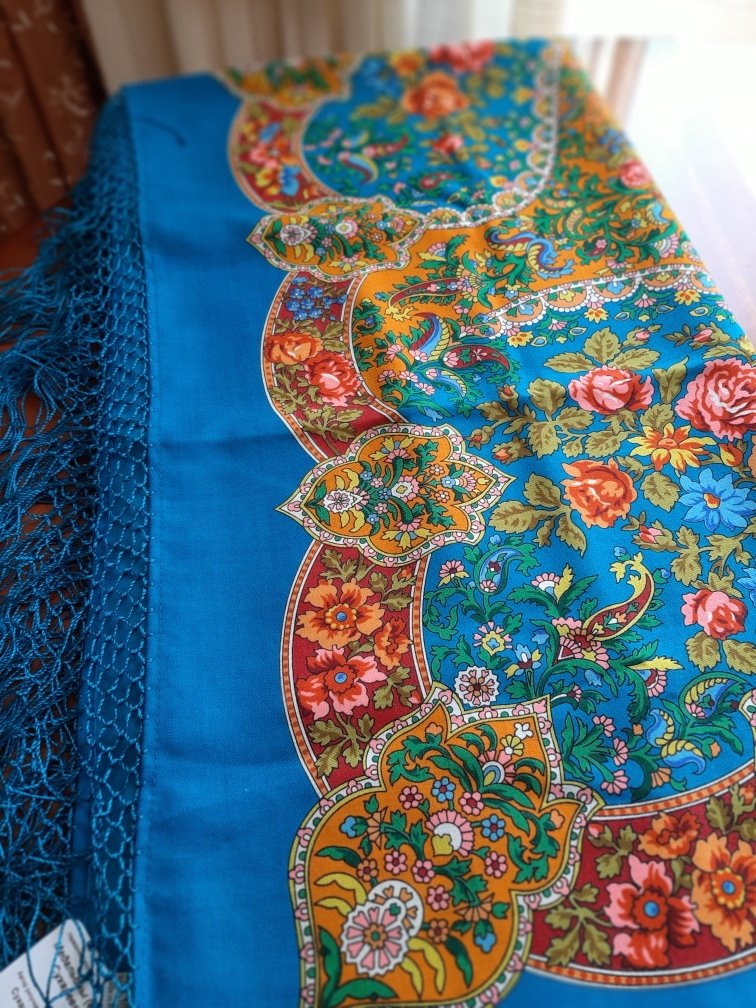 Открываю пакет с почты, а там ... голубая Шаль! Что такое? Разворачиваю... а там - ! Солнышко с бирюзой, драгоценные каменья! Полный восторг! Голубого - почти полшали, можно подогнуть оранжевую серединку - и вот она уже голубая, с голубой бахромой! А можно - развернуть во всей красе! Ух! :: :: ::