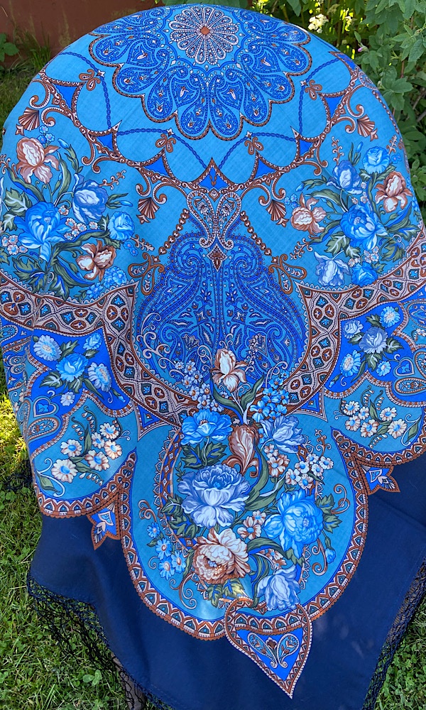 Собрала третий интересный мне колорит среди размера 89. Третий платок где цвет каймы не то морской волны (она всякая бывает), не то загадочной бирюзы горного озера. Первые два это Камаринская 12 и Воздушное настроение 12. Теперь к ним прибился Русский Перепляс 11.