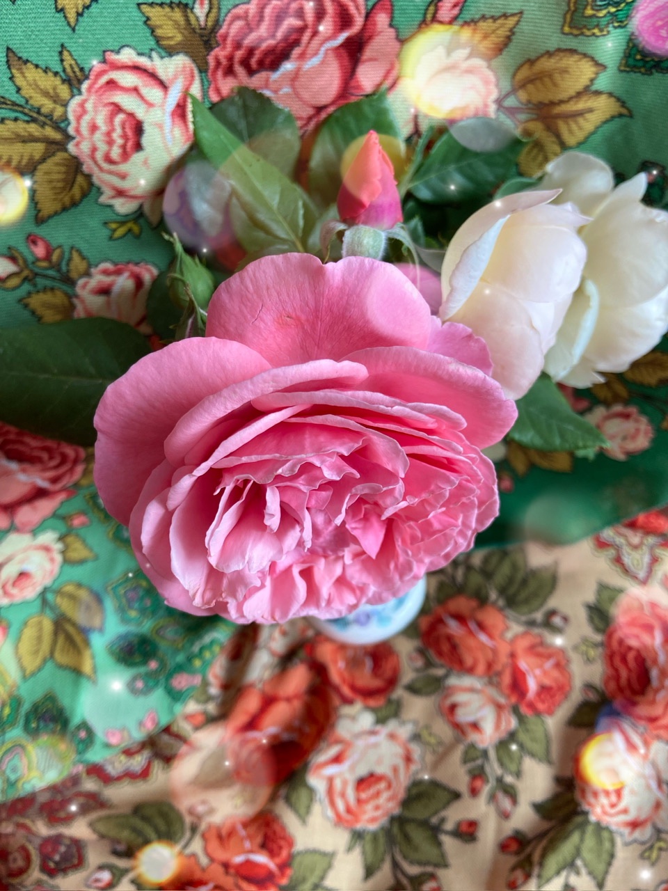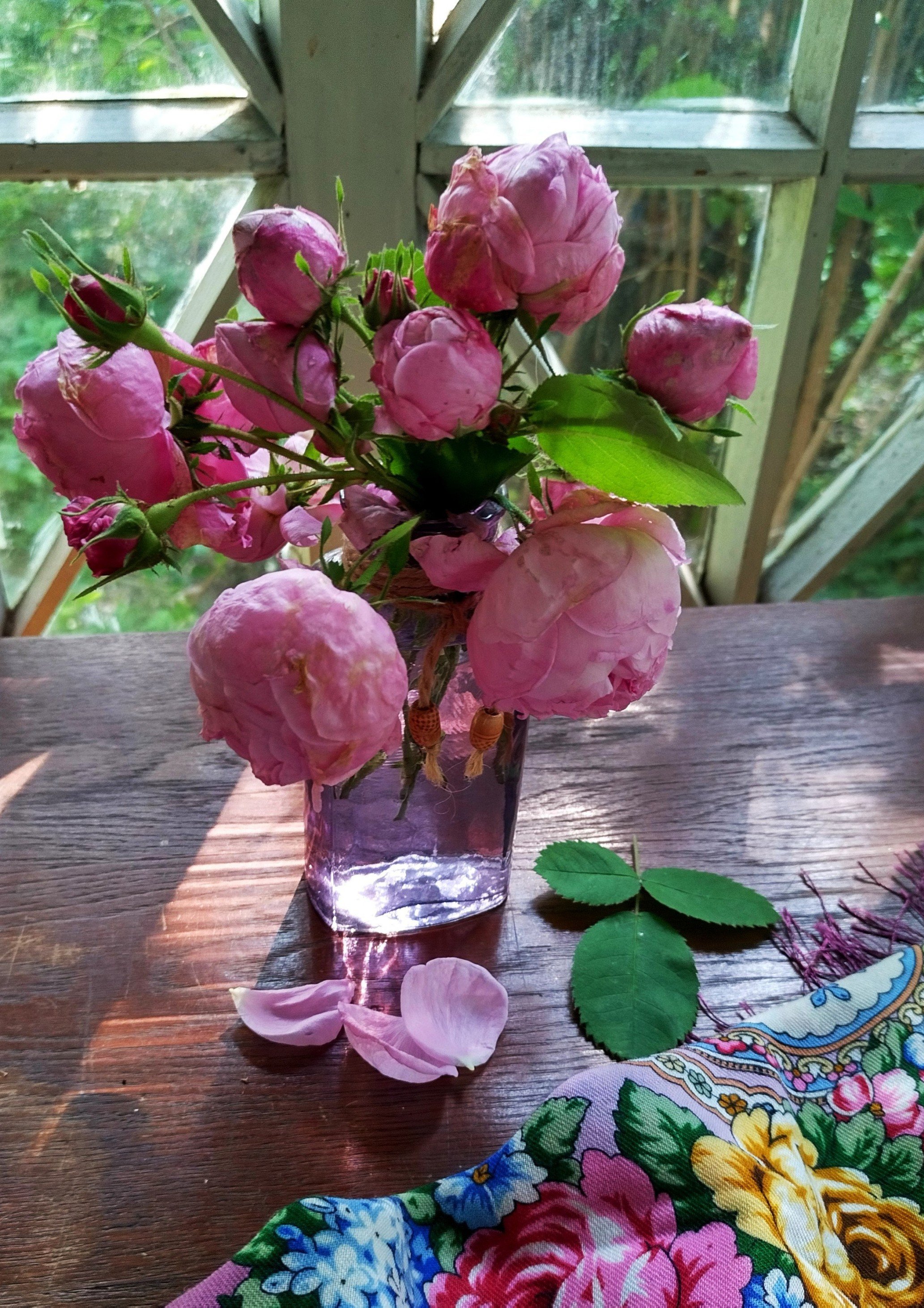 Не видно, где живые розы, а где розы на платке. Всё слилось в единый красивый букет.
