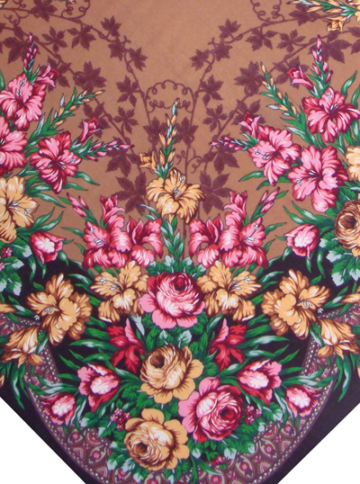 Что же касается "незаполненной серединки", то да, вероятно платок менее интересен по сравнению с "Балом цветов" именно этим. Но тут есть одно "но" - пустая серединка как нельзя кстати тем, кто носит платок так, как часто ношу я - сначала надевая на голову и один конец обкручивая вокруг шеи, а потом, "колпачок" (то, что на голове) плавно опуская воротничком вниз, к плечам. В таком варианте - "воротничок" остаётся моноцвета - а все цветы - не теряются, видны. В общем - во всём - своя прелесть!