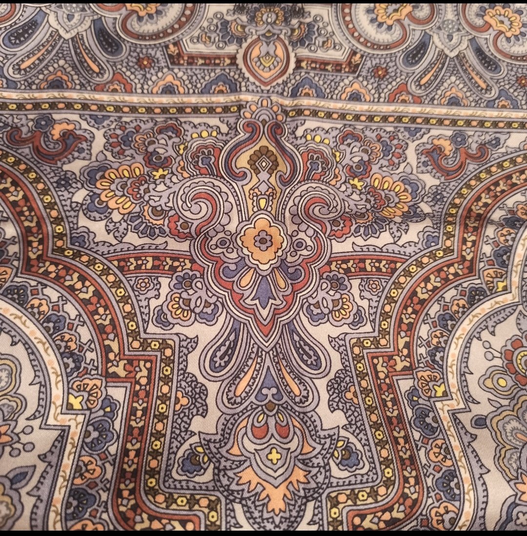 Очень рада, что у меня теперь есть эта шаль. Нарядная и повседневная одновременно. Очень правильный красный (для меня) по кайме--холодноватый. Рисунок в тему "Терема".