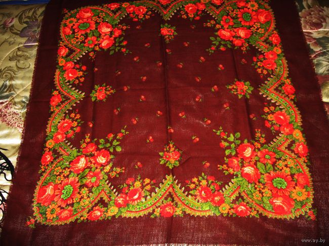 Весёленький такой, традиционный платочек из самого настоящего БС. Надеялась, что у нас есть такой рисунок. Но, увы, пока не нашла... Размер 150х150, думаю...