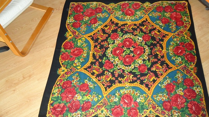 Хочу представить на суд знатоков платок моей милой подружки. Платок куплен в художественном салоне в Петразаводске в самом начале 80х. Он без кистей, из плотной шерсти, очень большой, настоящая шаль. Я его видела вживую - кажется ручной набивки или даже росписью по шерсти. Платок похож на "Русскую красавицу" Ольшевской, но все же это другая шаль - в нем серединка заполнена розами, а в рисунке Ольшевской только "огурцы". Будем с подружкой рады, если кто-то его опознает.
