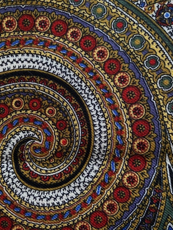Мне экземпляр пришел густого , темноватого колорита. Показалось даже, что цвет каймы близок к модному цвету года 2023--маджента, карминовый. Иногда, при ярком освещении этот красный вспыхивает теплым огоньком, но остается таким же насыщенным. Ткань тонкая, гладкая. Качество хорошее. Изготовлен 14.11. 2022.