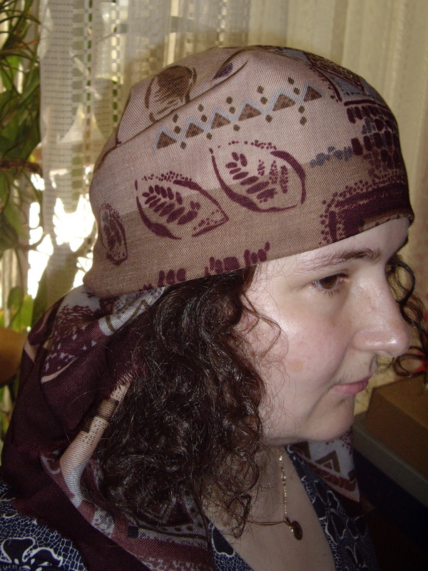 KittyFe! Замечательно Вам идет платочек! Очень хорошо, что у Вас длинные и вьющиеся волосы; сохраняется объем, и пряди вдоль лица тоже здорово...Сама люблю так повязывать голову, но выходя на улицу приходится вертеть"тюрбаны"(ну нету у меня такой как у Вас "гривки"!)...Представляю, как глядя на Ваш способ ношения платка, сразу вспомнит Среднюю Азию Argon...женщины Востока, (даже "освобожденные", всегда носили, носят, наверное будут носить платки...) и МЫ ТОЖЕ!!!!! Удобно, комфортно, жаль, на работе не поймут...дресс-код, будь он неладен!