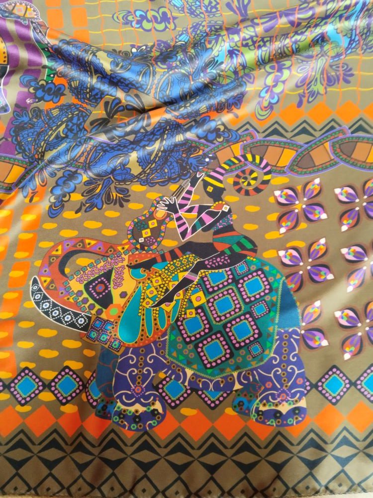 Несмотря на теплый-оливковый основной фон платок может быть синим, фиолетовым, красным, оранжевым, желтым, бирюзовым.