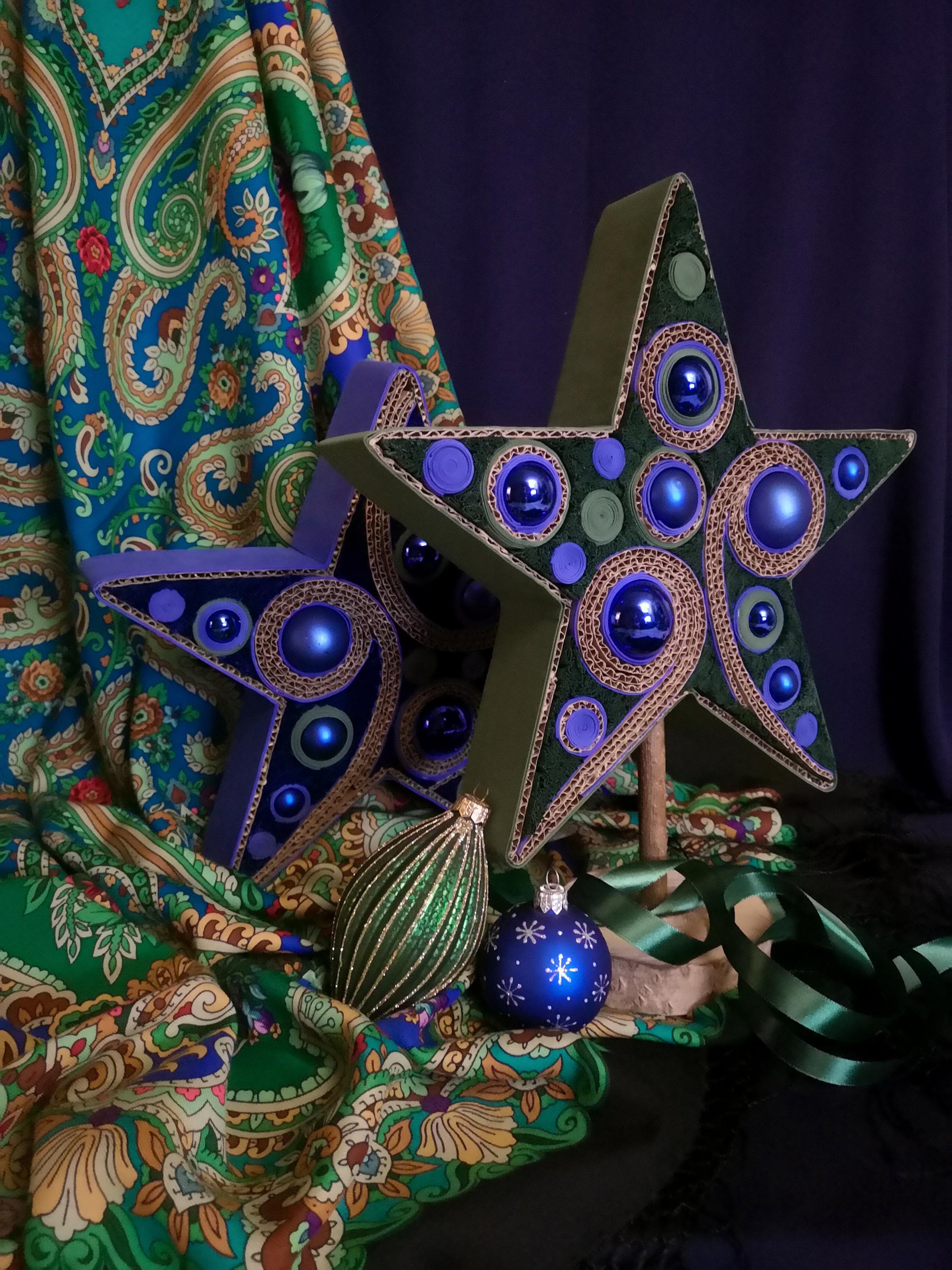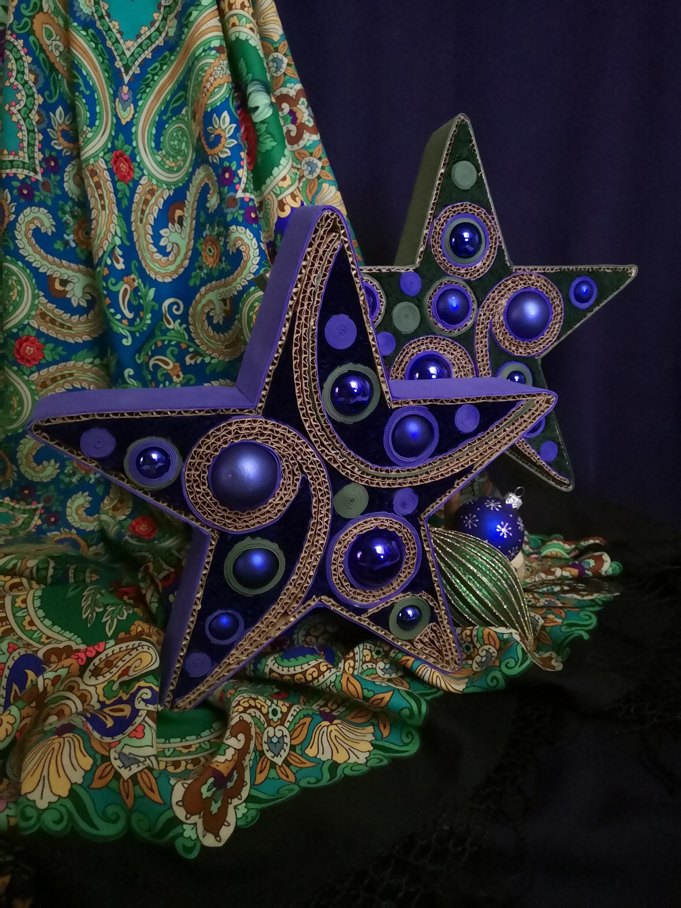 Увидела в прошлом году в запрещенной сети, у одной мадам флориста из Белоруси, новогодние украшения в виде звезд. Так они мне понравились, что захотелось сделать нечто похожее. Вот такие звезды получились у меня.