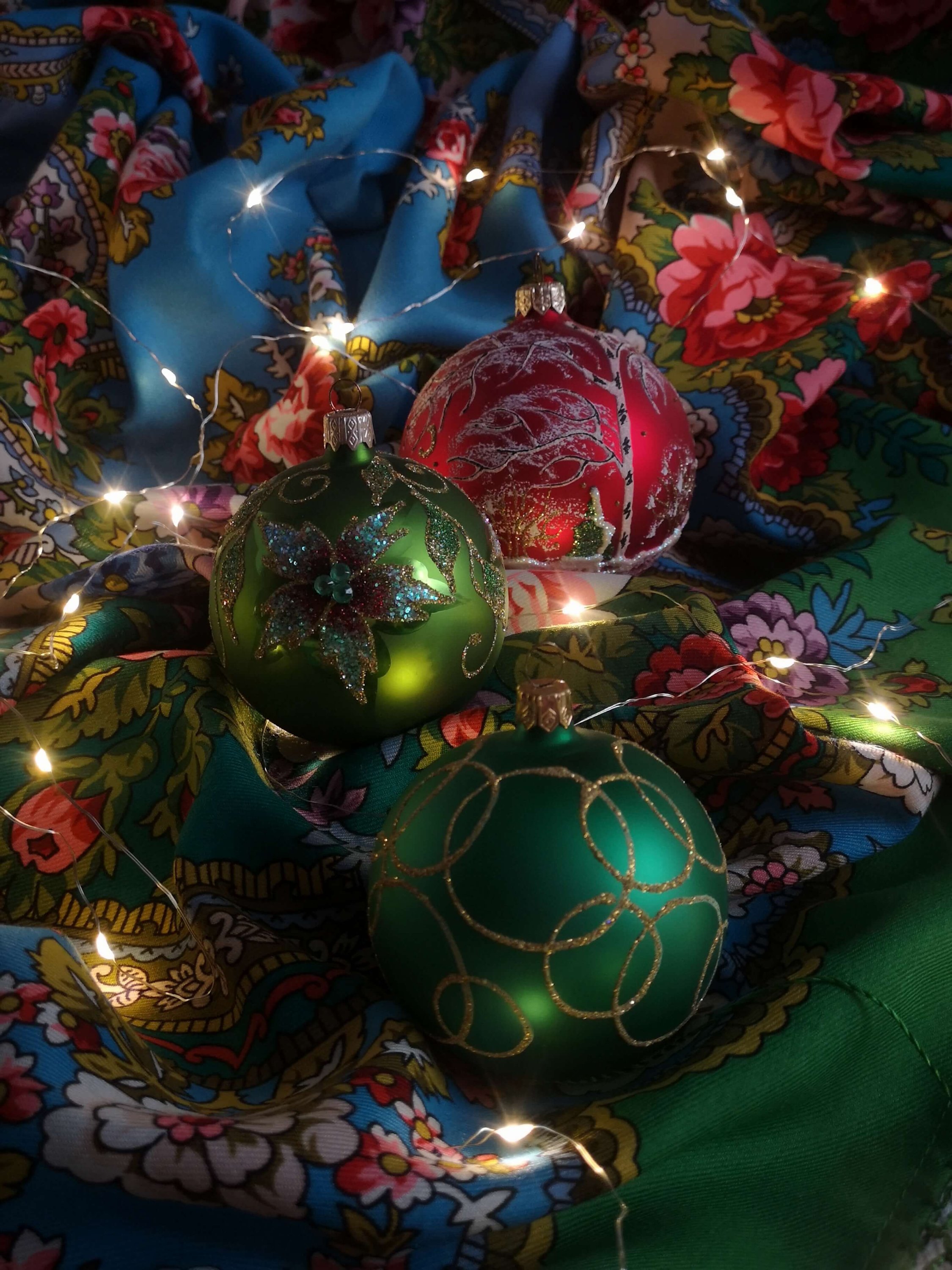 Платок "Бархатная ночь"(художник Т.Сухаревская) и клинская ёлочная игрушка