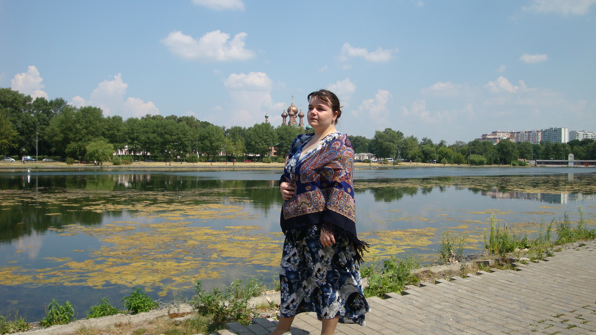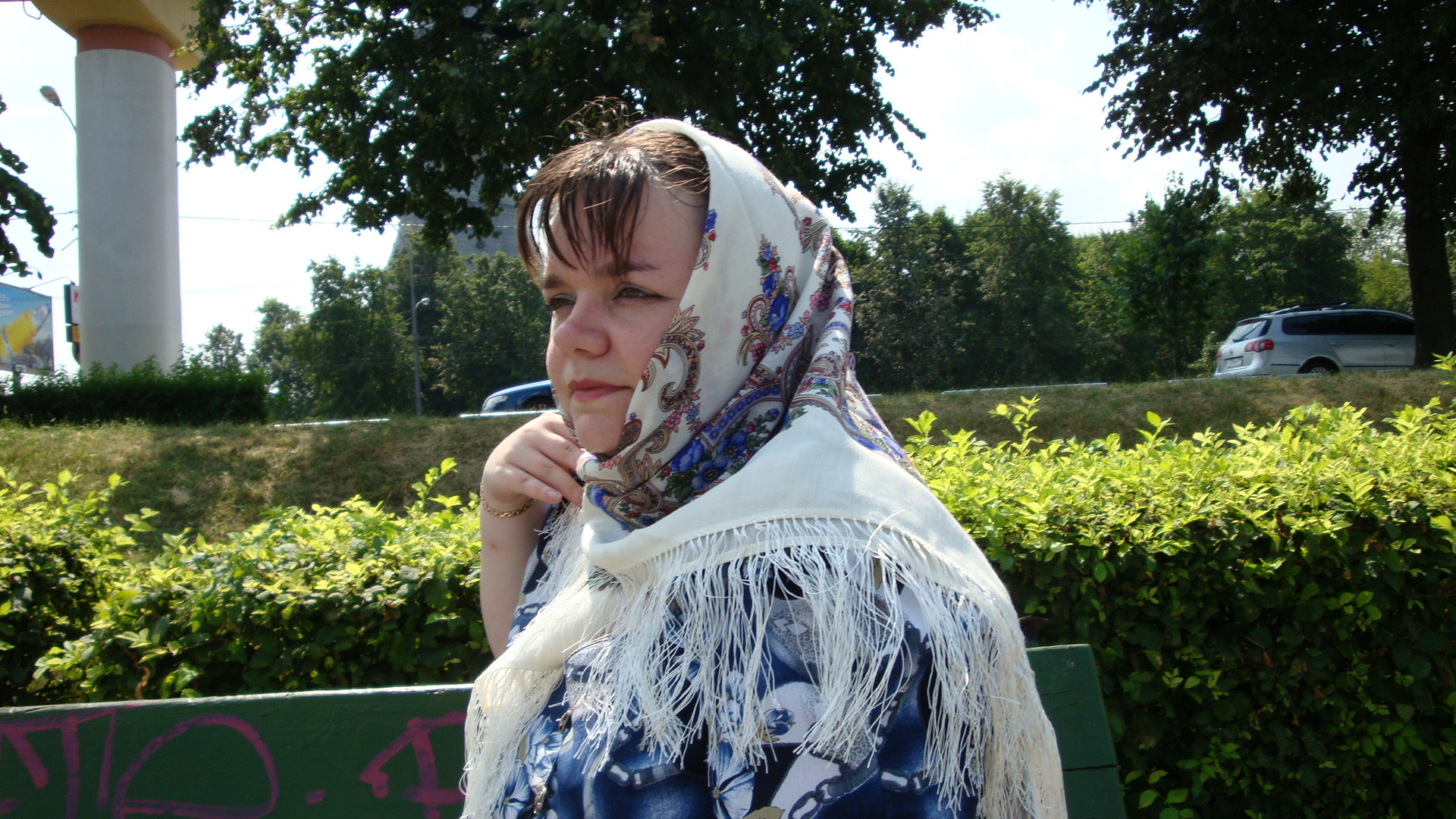 Гуляли вчера с дочкой в роще. Жарковато было, за 30. Платок просто взяла с собой, чтобы сфотографировать в безлюдном месте. Героически отщелкались и спрятали его в сумку.