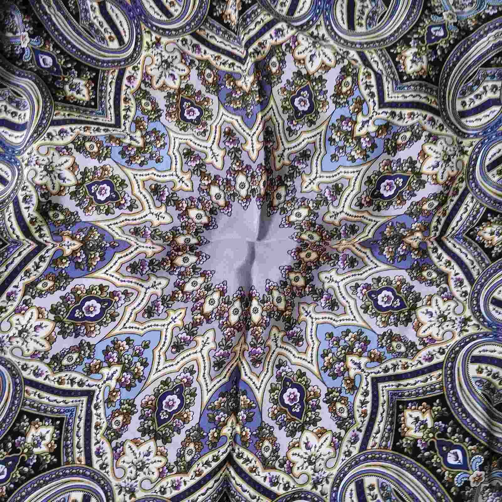 Фиолетовым не показался. Просто темно-синий цвет, может быть с едва кобальтовым подтоном и то при различном освещении. На солнышке--непонятный синий (грязноватый, в хорошем смысле : антрацит, серый, графит, коричневатый ) . Сиреневых оттенков много в узоре. Ткань очень гладкая, плотная, пластичная и шелковистая--удовольствие!