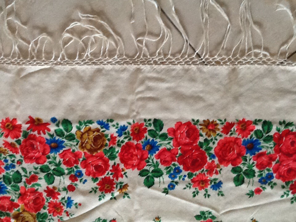 Добрый день, шалезнатоки, вот еще один любимый платок хотелось бы опознать. Куплен в 80-е годы в России , в Сибири, привезли в подарок.За годы платок остался таким же красивым, стирали, а платок, как новый. /бахрома шерстяная/Платок все эти годы излучает свет и радость, тепло.