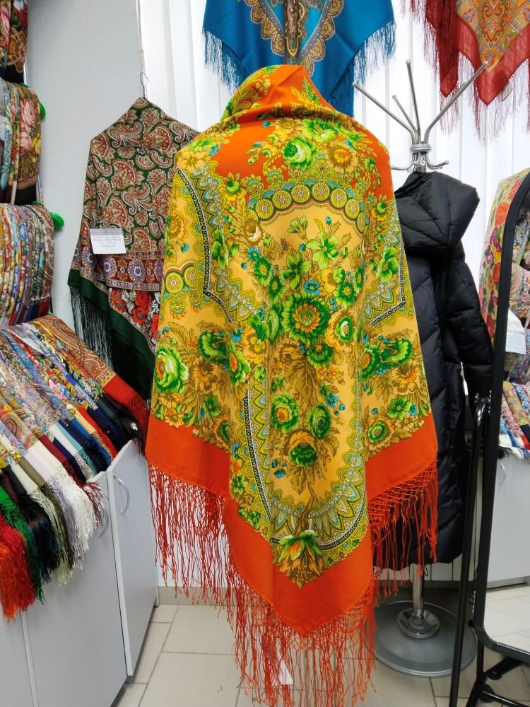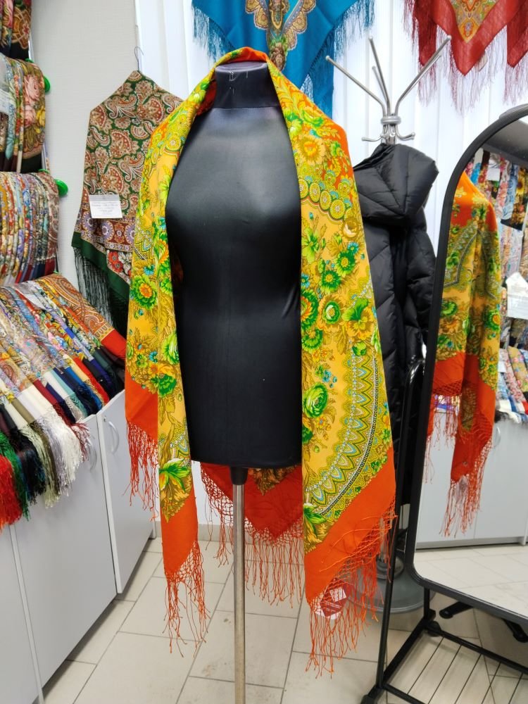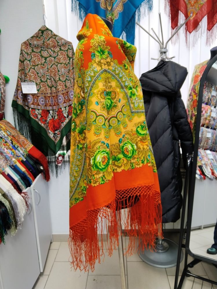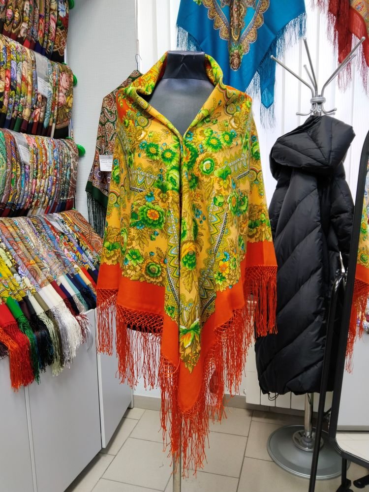 Тут вот манекен без одёжи, подставить можно мысленно вовнутрь любое, но по цвету верхние, как мне кажется получше, почестнее, тут немного больше желтого видят мои глаза, в жизни всё же оттенки оранжевого на шали.