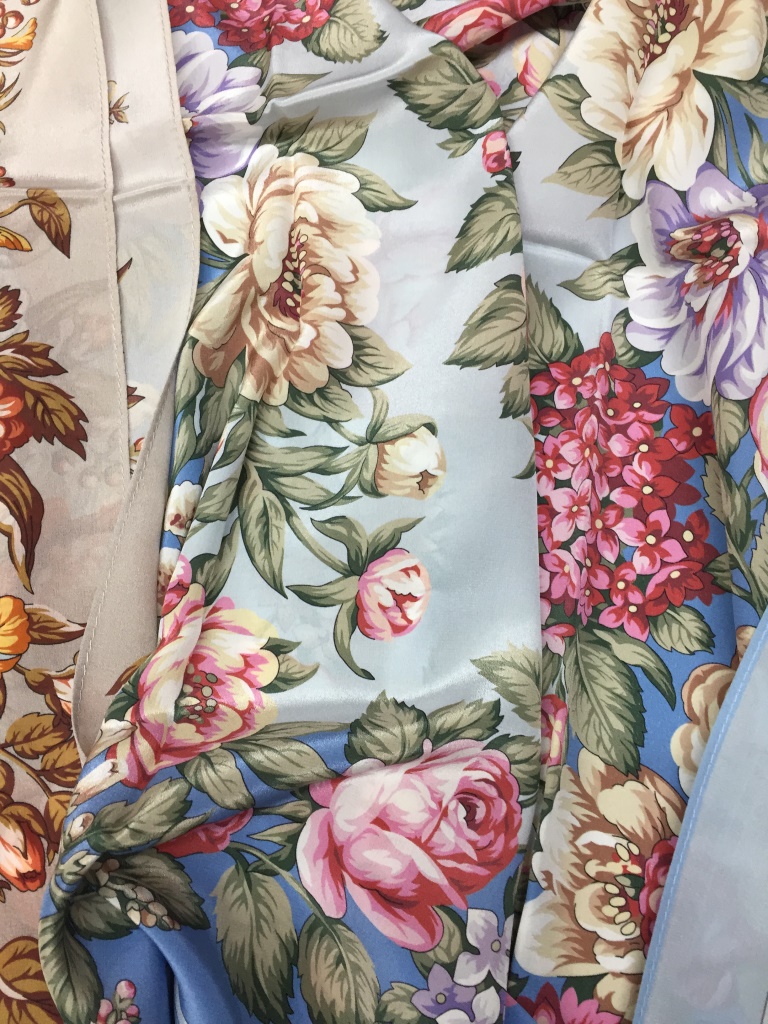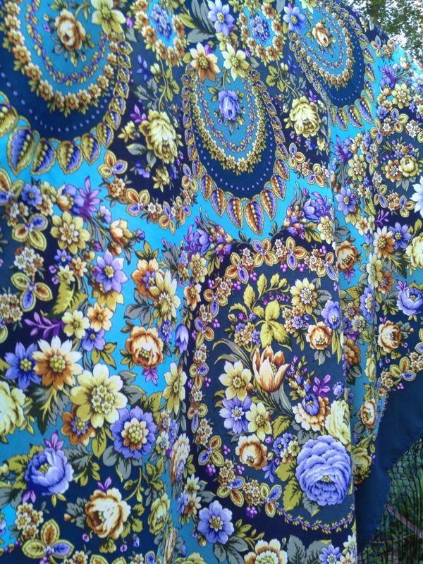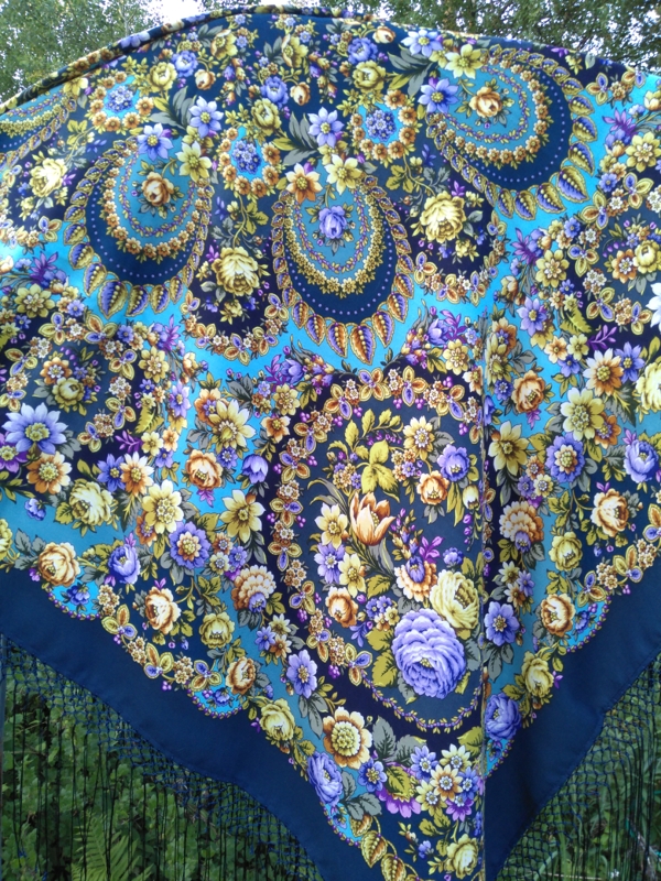 Ещё хочу отметить - шаль очень лёгкая, ткань нежная, тонкая (но плотная, не рыхлая), очень гладкая. И бахрома из каких-то тонких ниток, но впечатление редкой не производит.