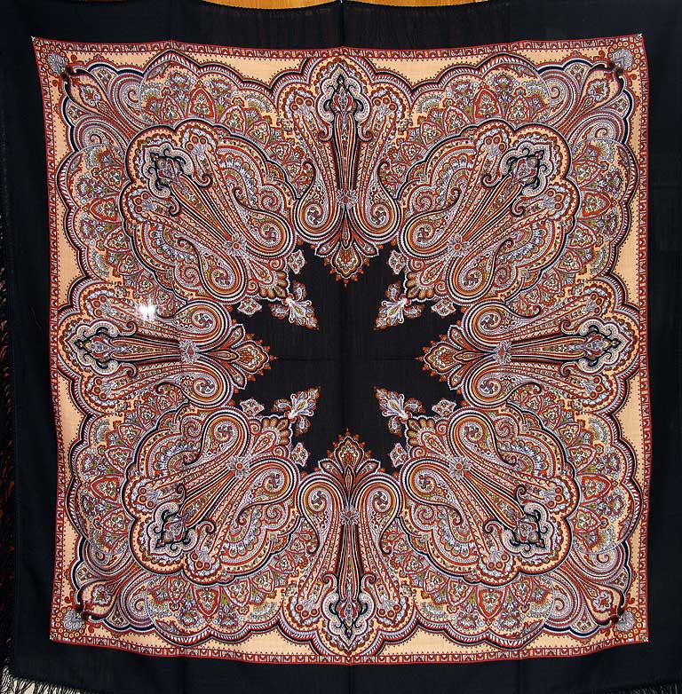 Этот платок "Сады Шираза" (855-7 размер 89х89 шелковая бахрома) еще есть на сайте, в печатном каталоге его нет. У него очень мелкий сложный рисунок, который трудно разглядеть на сайте, а жаль!