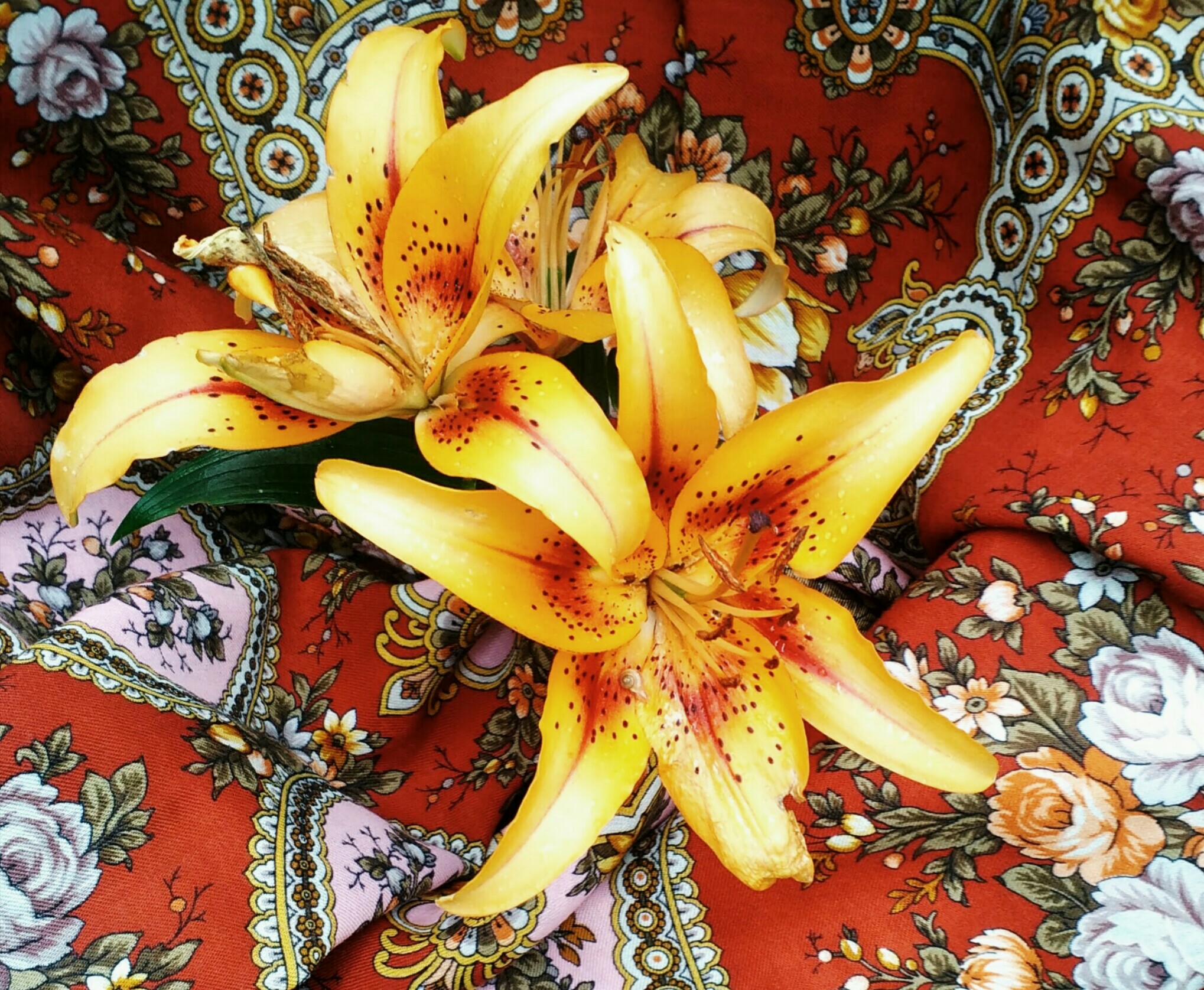 Цвет настроения - рыжий, т к расцвели рыжие лилии, другие цвета на подходе, в бутонах, на полтора- два месяца раньше. Прошлое лето цвели в августе. Платочек Нежное сердце Ю.Уткиной