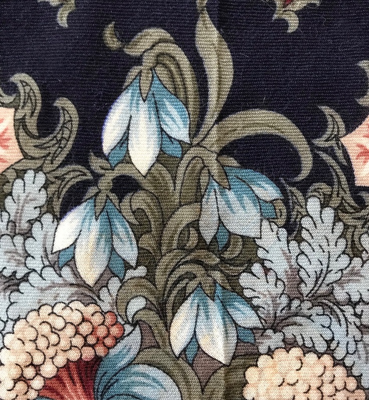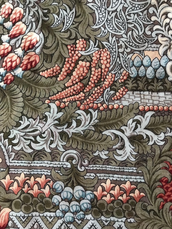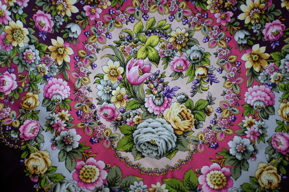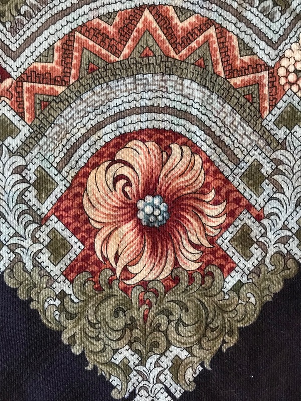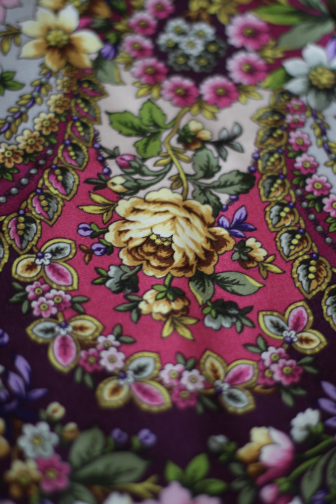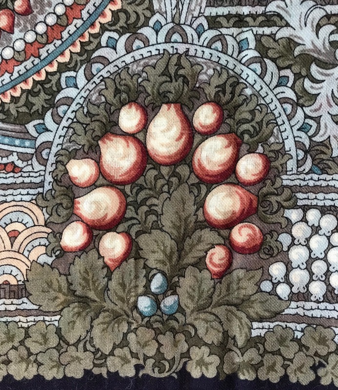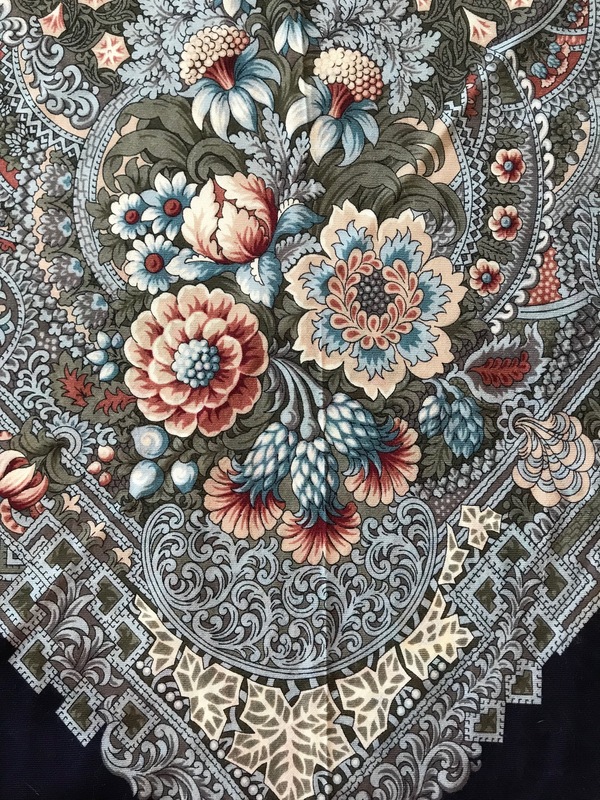 "Бархатная ночь", вид 14, 146x146 см--один из самых "зачарованных" платков! Ассоциируется с заросшей , старой усадьбой, у пруда, где сквозь орнамент каменных стен, растут непохожие цветы...Здесь и плющ, и хмель, вьюнок полевой, папоротники, и даже камыш...