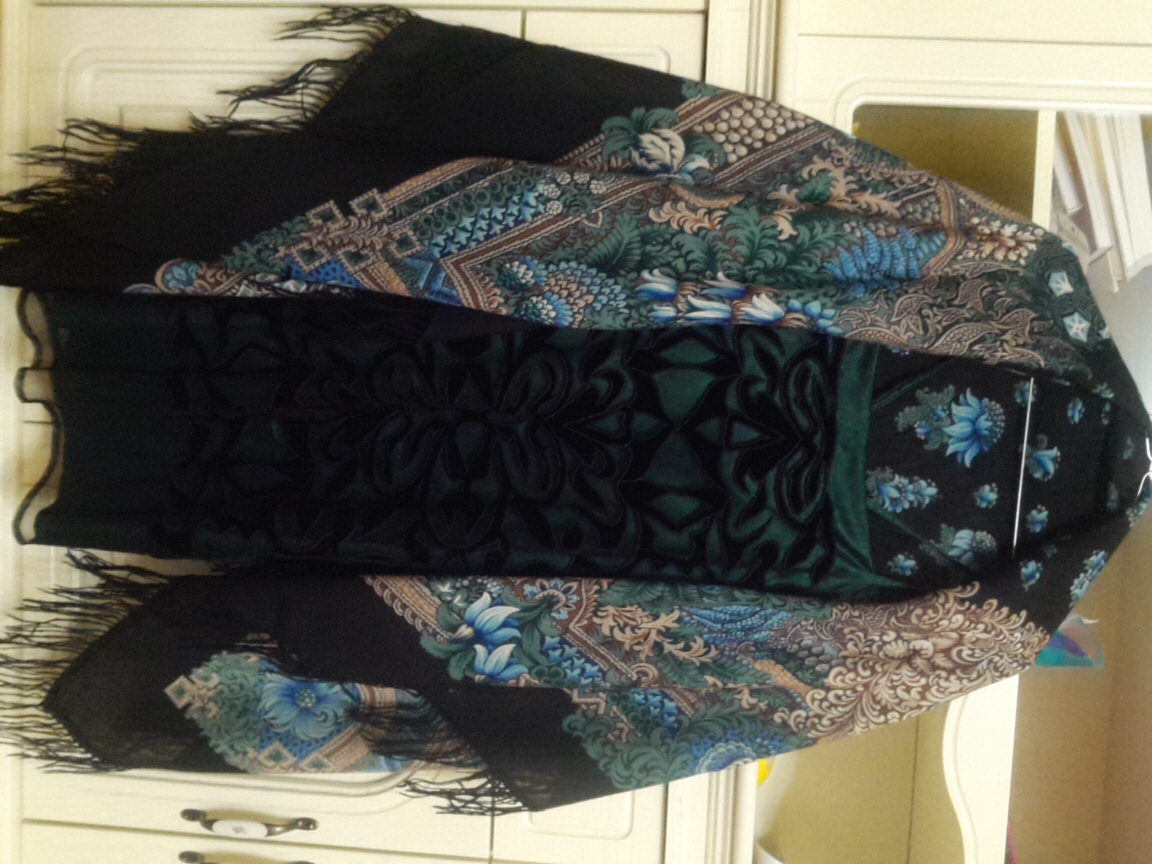 По стилю нужна шаль у которой середина пустая и есть цвета ярко-синий,изумрудно -зелёный и чёрный.