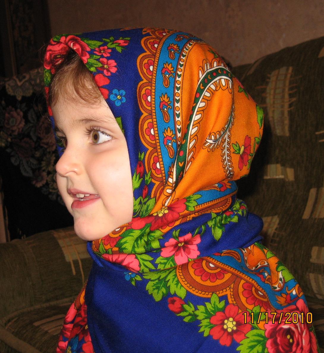 Сегодня покажу дочку, ей скоро три годочка. Маленький Балаганчик она давно считает своим платочком, я его никогда одеть не могу. А тут недавно я получила посылочку с распродажными платочками, разложила их и спросила дочку какой самый красивый? Анютка выбрала Русь и заставила меня повязать на ней шаль. Теперь Русь тоже её платочек. Кто-то сетовал, что шали размером 148 не на всякий рост подходят. Анютка ростом 1метр, и ей шаль не кажется большой.