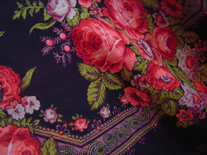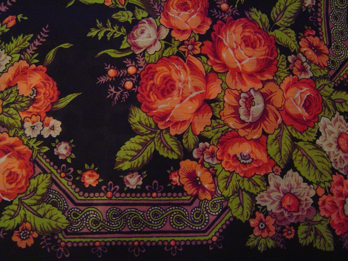 Татьяна-Золушка, я не могу быть на сто процентов уверенной, но мне кажется, что это польский платок. Польские платки, которые я часто вижу на западных аукционах, сделаны так же - по принципу красивой ткани (повторяющийся на определенном расстоянии цветочный паттерн), а не по принципу картины, как платки ППМ - нет рамки-каймы, рисунок не строится на 4 угольный, объединенным в единый ансамбль, а идет постоянным ритмом, постоянным повторением одного и того же паттерна по всей ширине грунта.