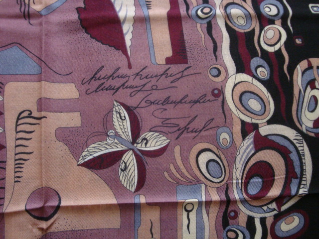 Платочек Отражение скоро отправится к моей подруге. Это будет ее первый шерстяной павловопосадский платок. Она сама его выбрала по каталогу. Я присмотрелась - действительно что-то есть в этом платочке: уголки все разные, необычная кайма " с треугольничками", надписи, стилизованные бабочки и листочки. Простор для воображения. ::