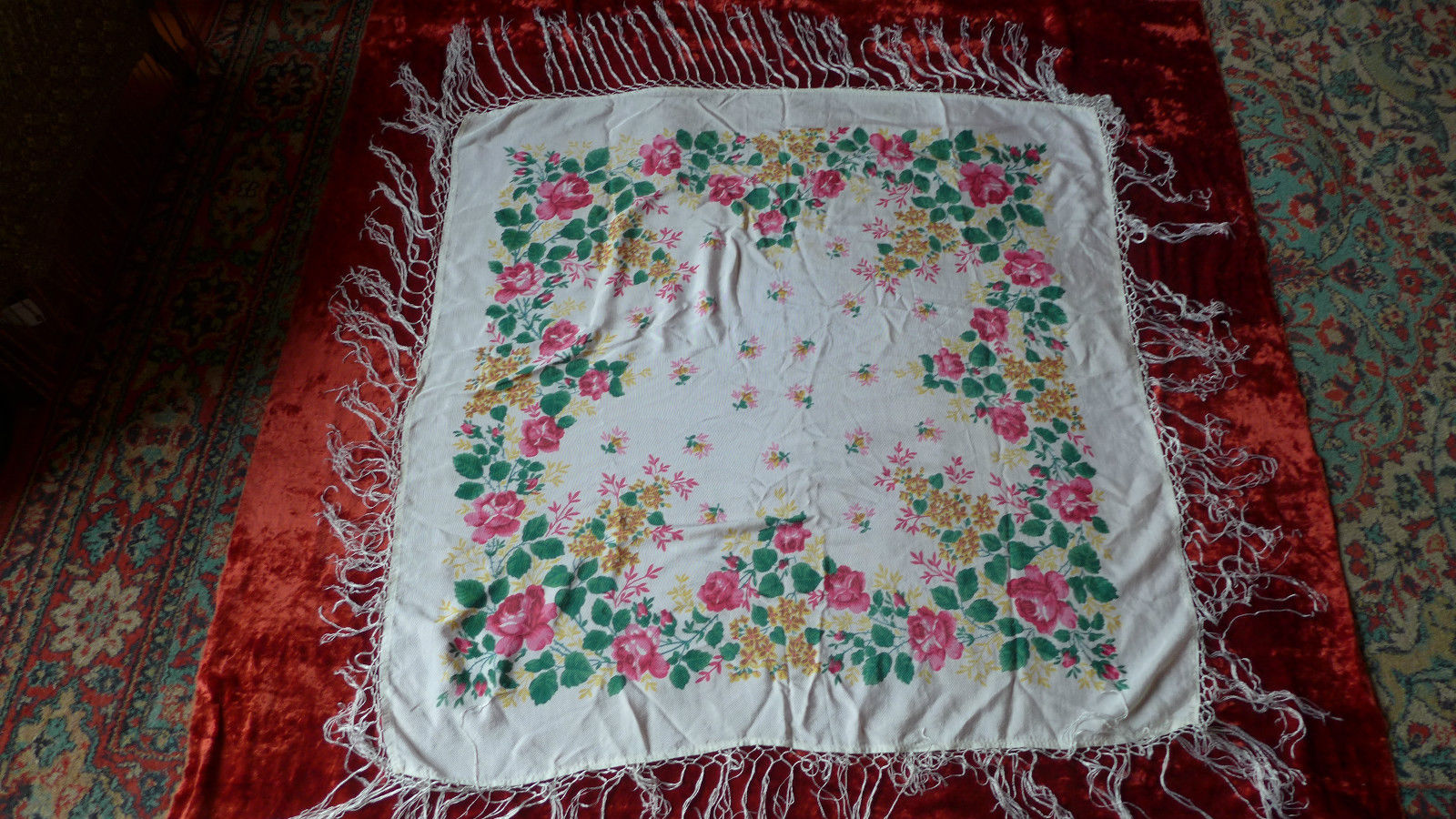 Добавлю два платочка 90х90 одного рисунка, напечатанного на смесовой ткани с вискозной бахромой: