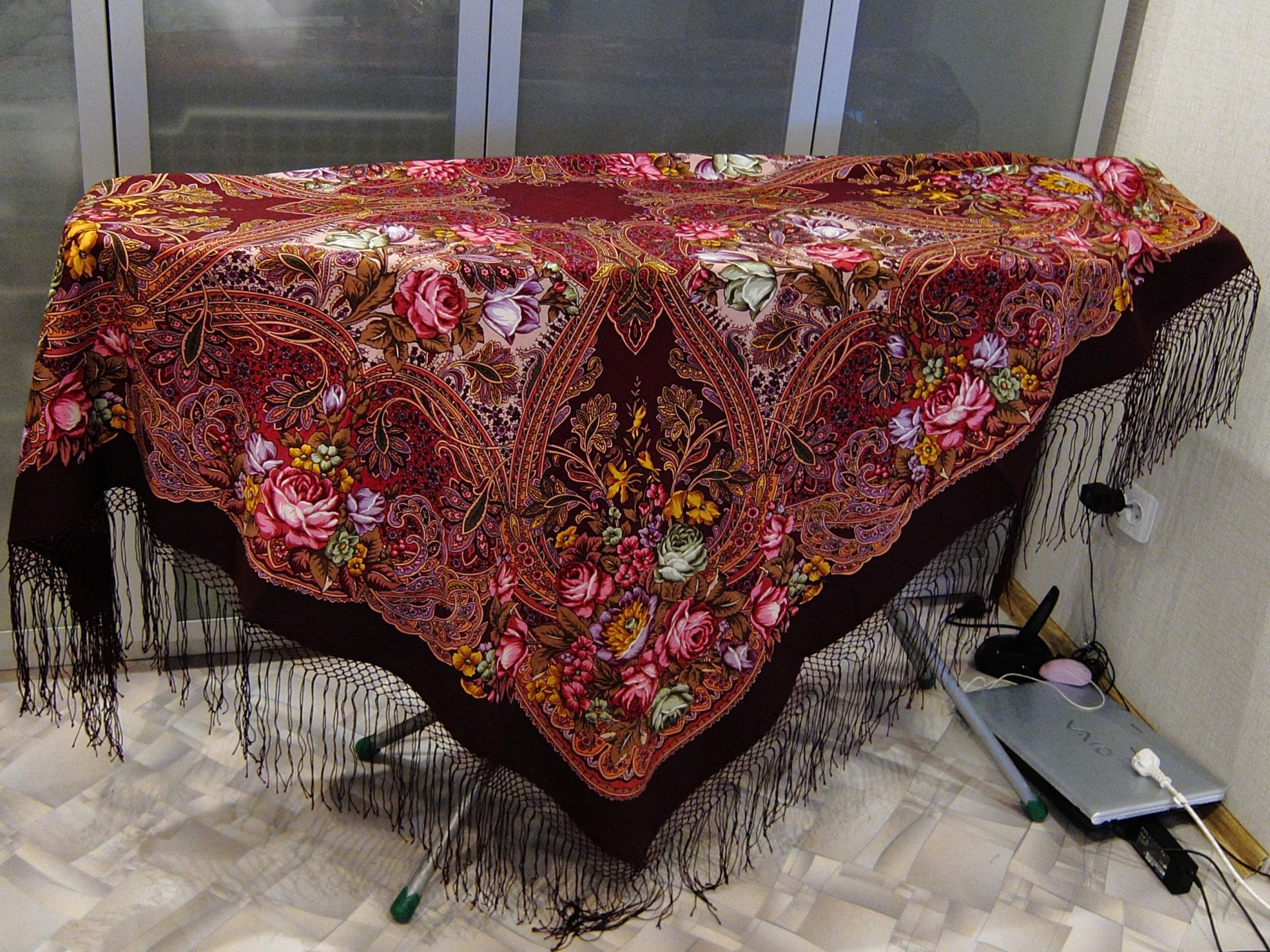 Кайма у платка цвета морской волны, что мой монитор не передает и в магазине стало для меня неожиданностью. Подшит хорошо. Ткань как-будто погрубее чем у Царского села.