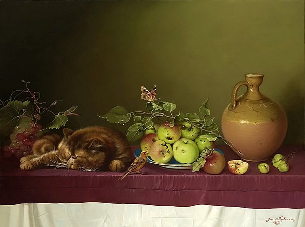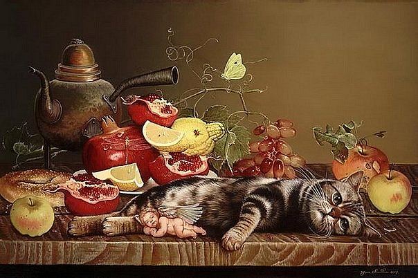 Селена, ^% просто замечательные друзья наши меньшие! Репродукция картины забавная; кто автор? У кошачьих лап даже ангелы отдыхают (или получают мурротерапию и мяуссаж?)...