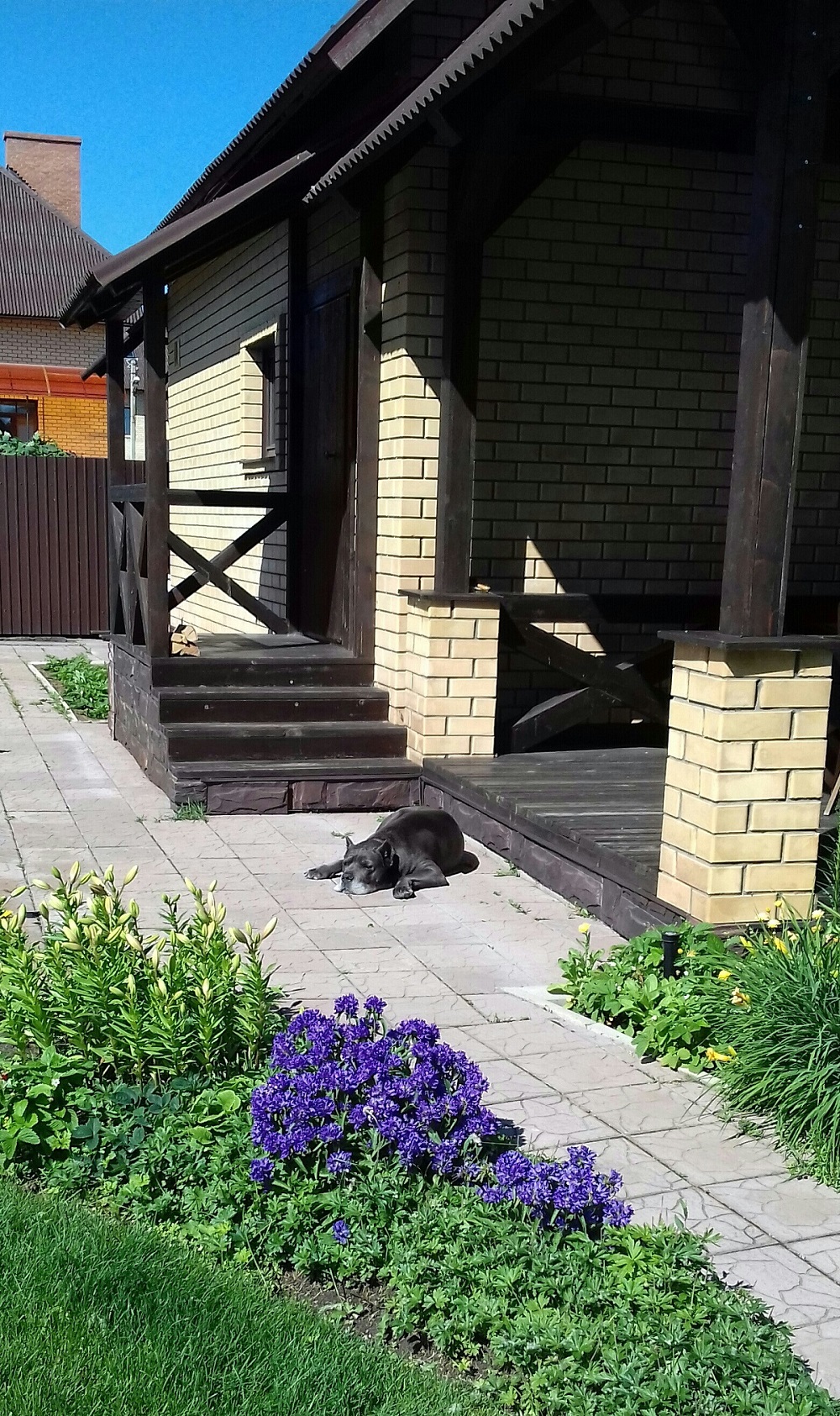 Есть у него любимое место - площадка перед баней - вот он там укладывается.