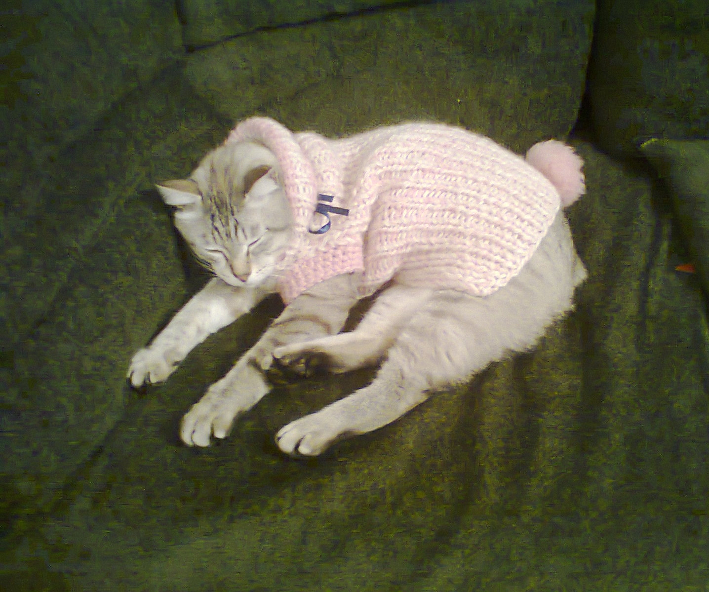 Я ему кофточку связала, ничего, ходит довольный. А первый раз одели, обхохотались с дочкой. Он на бок постоянно валился. Потом только на полусогнутых передвигался. Предпочитал в ней не ходить, сидеть. А сейчас и на диван, и на подоконник запросто запрыгивает.