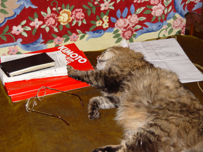 Тогда, 6-ти месяцев отроду, маленькая была, пугалась всего. Теперь то уже большая хозяйка в доме. А дома всё удивитльно получшало с появлением этого хранителя очага. Тася тоже является ценителем платков. Если на вешалке низко повесишь шаль, то бахрому лапами ловить начинает, а уж если вдруг шаль на стуле или диване оставлена, тут сразу придет ценитель и сверху развалиться.