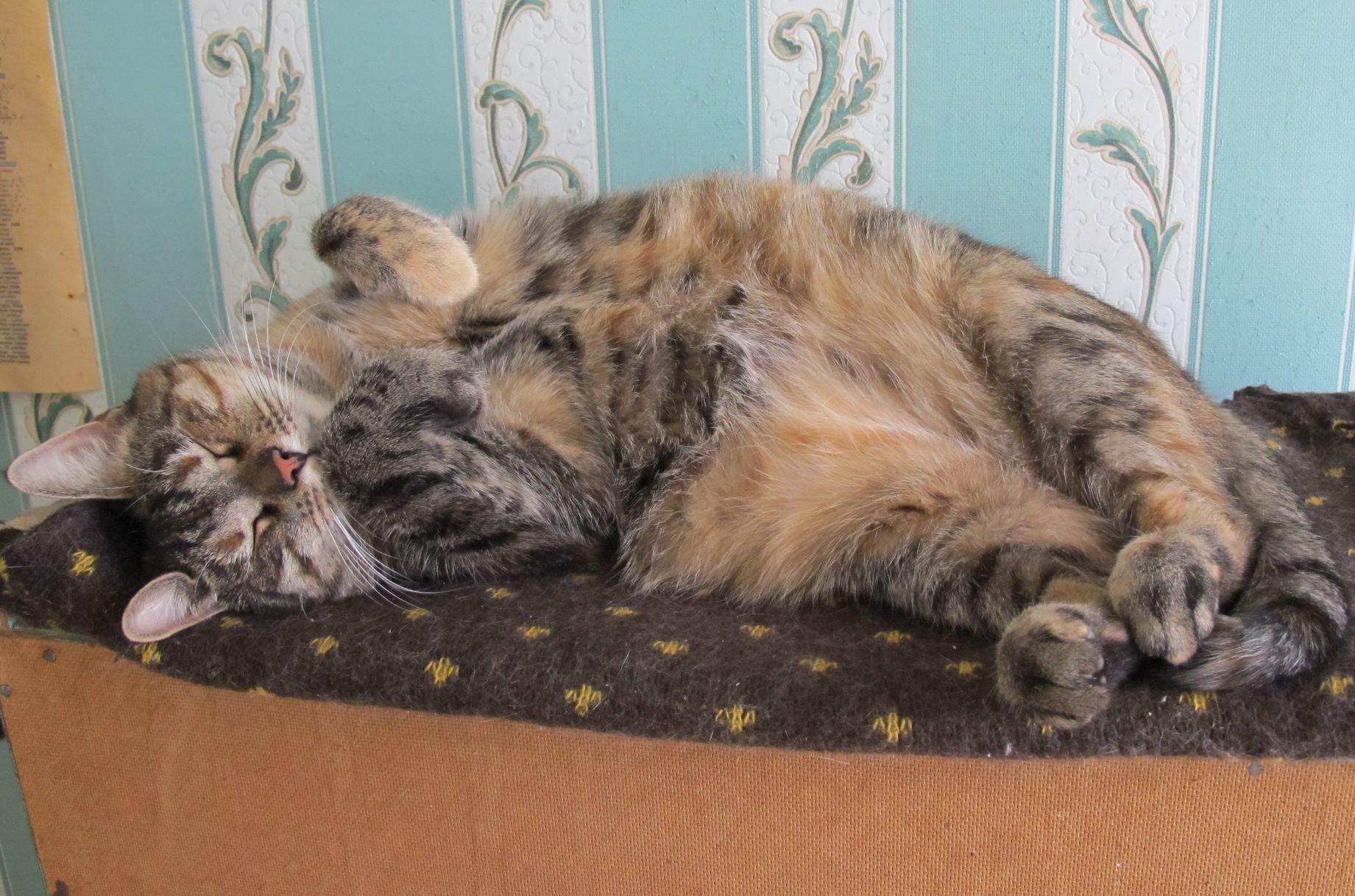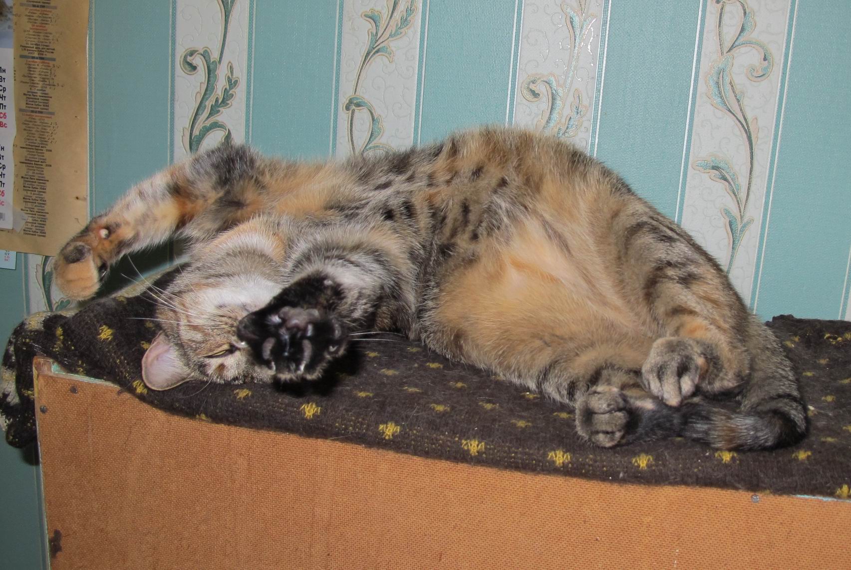 Лежанок очень много,в шкафах особенно любят, на полочках - открыть дверцу шкафа, залезть по полкам, как по ступенькам, повыше, все оттуда скинуть на пол и удобно залечь. Также на диванах, креслах и на моем письменном столе.