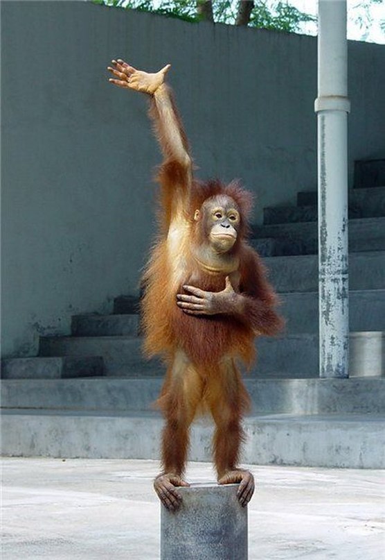 Вчера с сыном был в зоопарке и наблюдал следующую картину. В клетке сидит большой орангутан и свысока смотрит на проходящих людей. По его лицу сразу понятно, что «парень башковитый» и попросту напоминает научного сотрудника с похмелья. Возле его клетки собрались малые парни лет так по 12-14, кривят ему рожицы и при этом что то показывают и говорят. Прямо как в цирке, но с обратной стороны. Когда парням это наскучило, так как орангутан никак не реагировал, они успокоились...