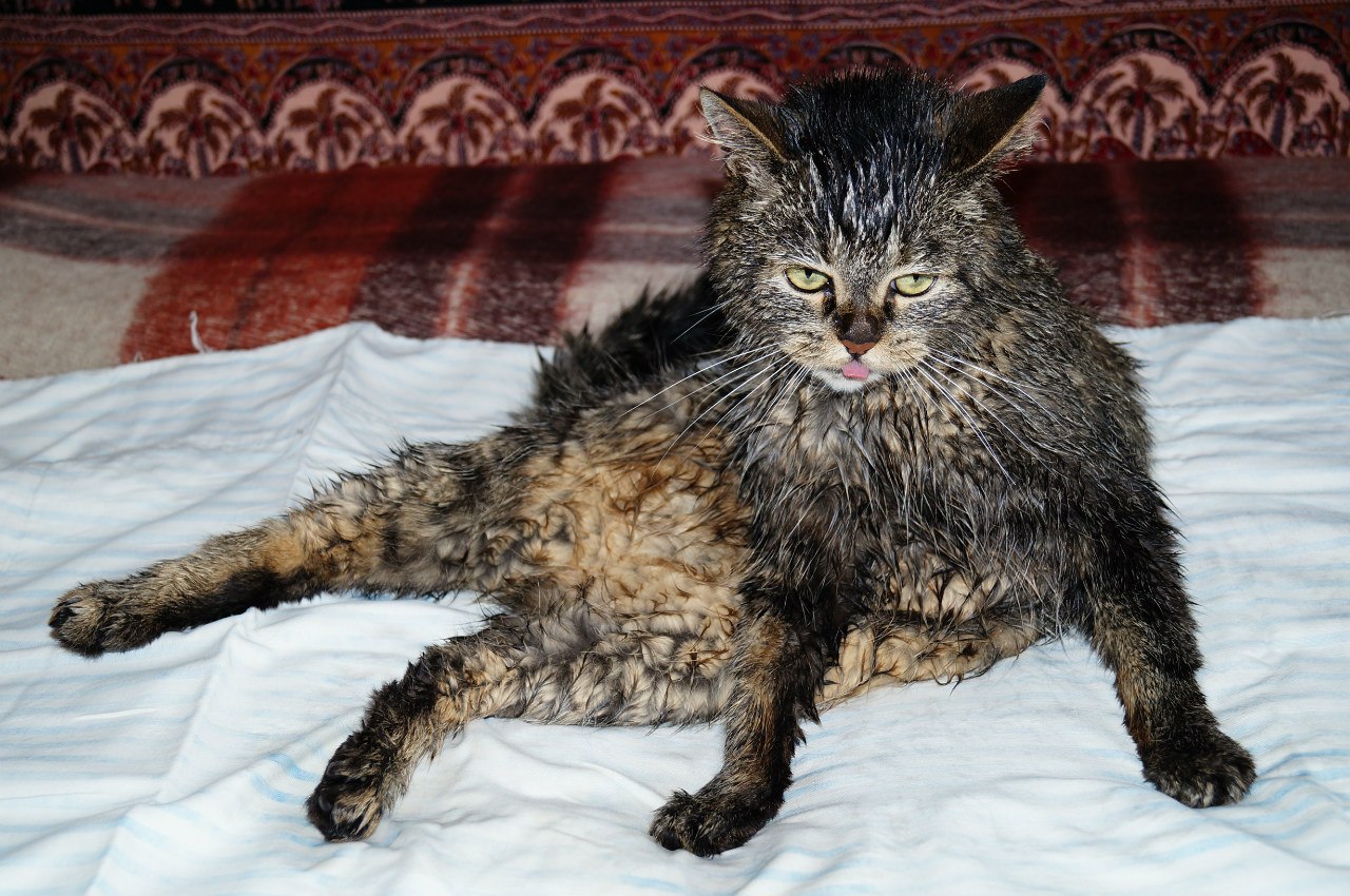 :<>: Нашего кота вообще один человек не мог мыть, один должен был держать задние лапы, а второй - мыть и держать передние. Иначе убегал.