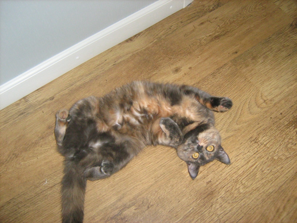 А моя вертихвостка спасается от жары в уголочке в коридоре (хотя обычно она спит исключительно на кровати). А в выходные закончится ее московское заточение - в деревню поедет, на природу, в поля-леса и в речке плавать )))
