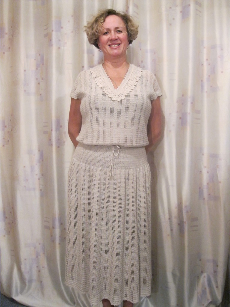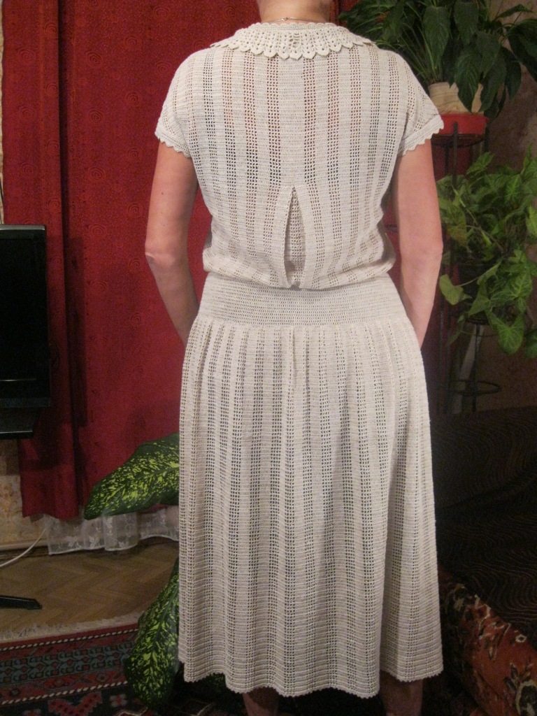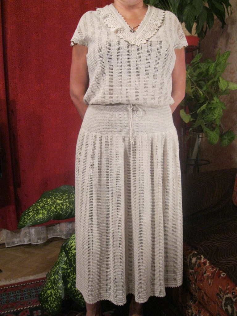Спасибо, милые. Что-то я много тут орфографических ошибок налепила. А ещё всё-таки покажу одно платье мною связанное 25 лет назад из хлопковых ниток. Хотела его в другой раз показать, т.к. на спине вывязан очень красивый рисунок, а фото сделано в этом году в Феодосии и спиной сфотографироваться мне как-то не пришло и в голову. Ну показываю так, как есть...