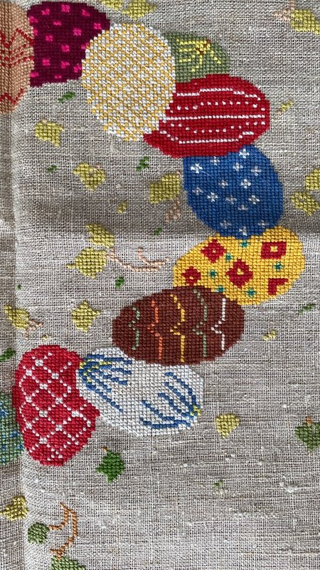 Я заканчиваю "Вечноцветущий сад". Нашелся мой забытый раритет--пасхальная скатерть 1994 года. За основу брала обычную льняную скатерть ( не равномерная канва). Сохранилась в отличном состоянии , будто вчера закончила.