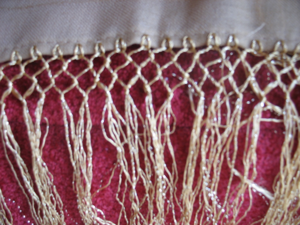 Натик писал(а):Мне тут ночью пришла идея по усовершенствованию процесса. Чтобы проколы для бахромы шли через равные промежутки и не заморачиваться с разметкой по линейке, можно проложить на швейной машине строчку над местом пришивания бахромы, выбрать длину стежка 0,5см, 0,6см или 0,7см, а если машина не позволяет делать такие длинные стежки, прокалывать бахрому через 2 стежка. Нитки взять потоньше и ослабить немного натяжение, а потом, после прокладывания бахромы, все это выдернуть.