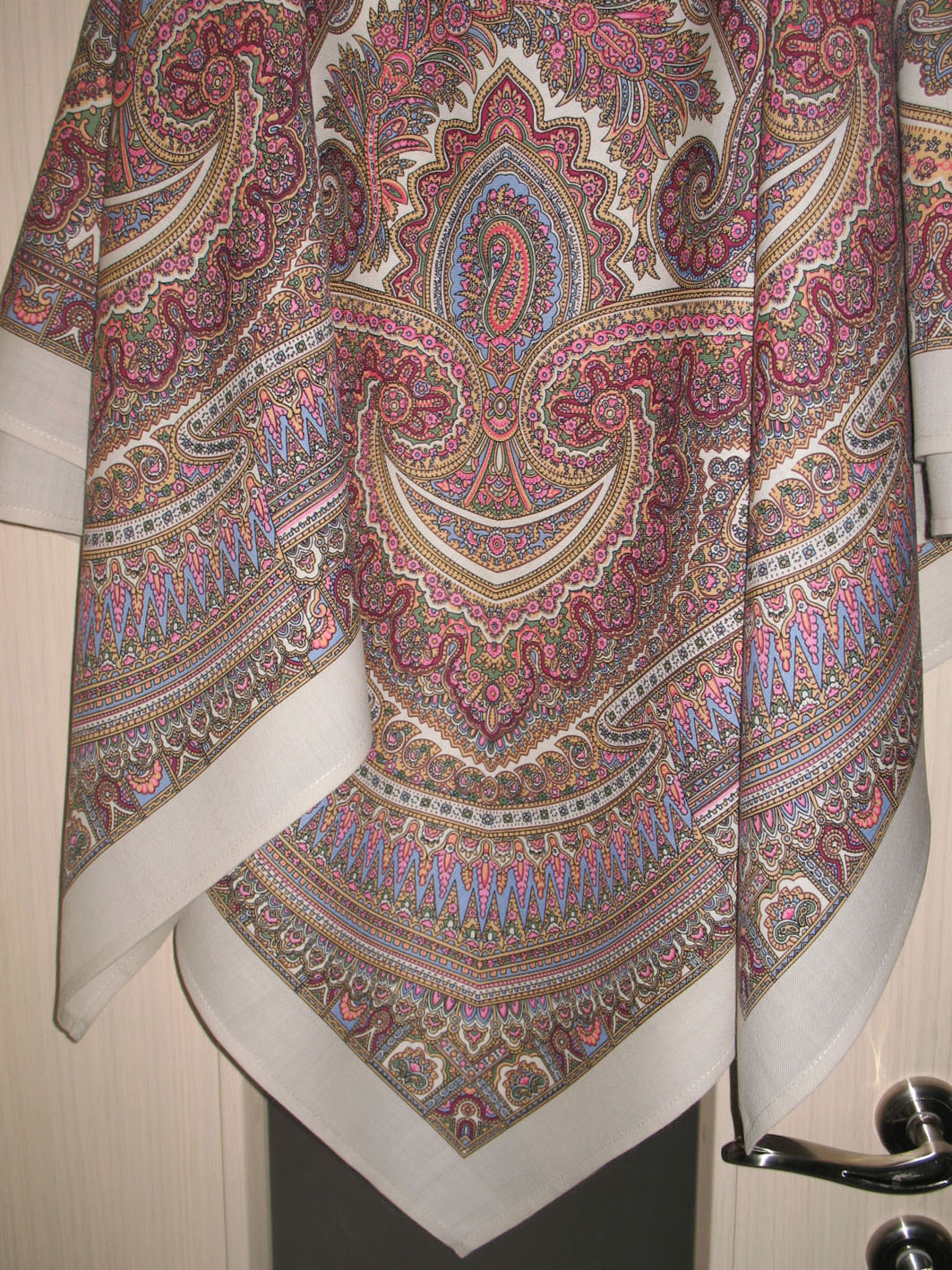 Что-то намоткой этот платок у меня не выходит. Там довольно крупные цветы и узор в стиле модерн. В намотке все пропадает.А Чеканковская бахрома получается довольно тяжелой. Вчера видела в магазине Мадонну с бахромой. Такая, как у всех просновочных. Простая.