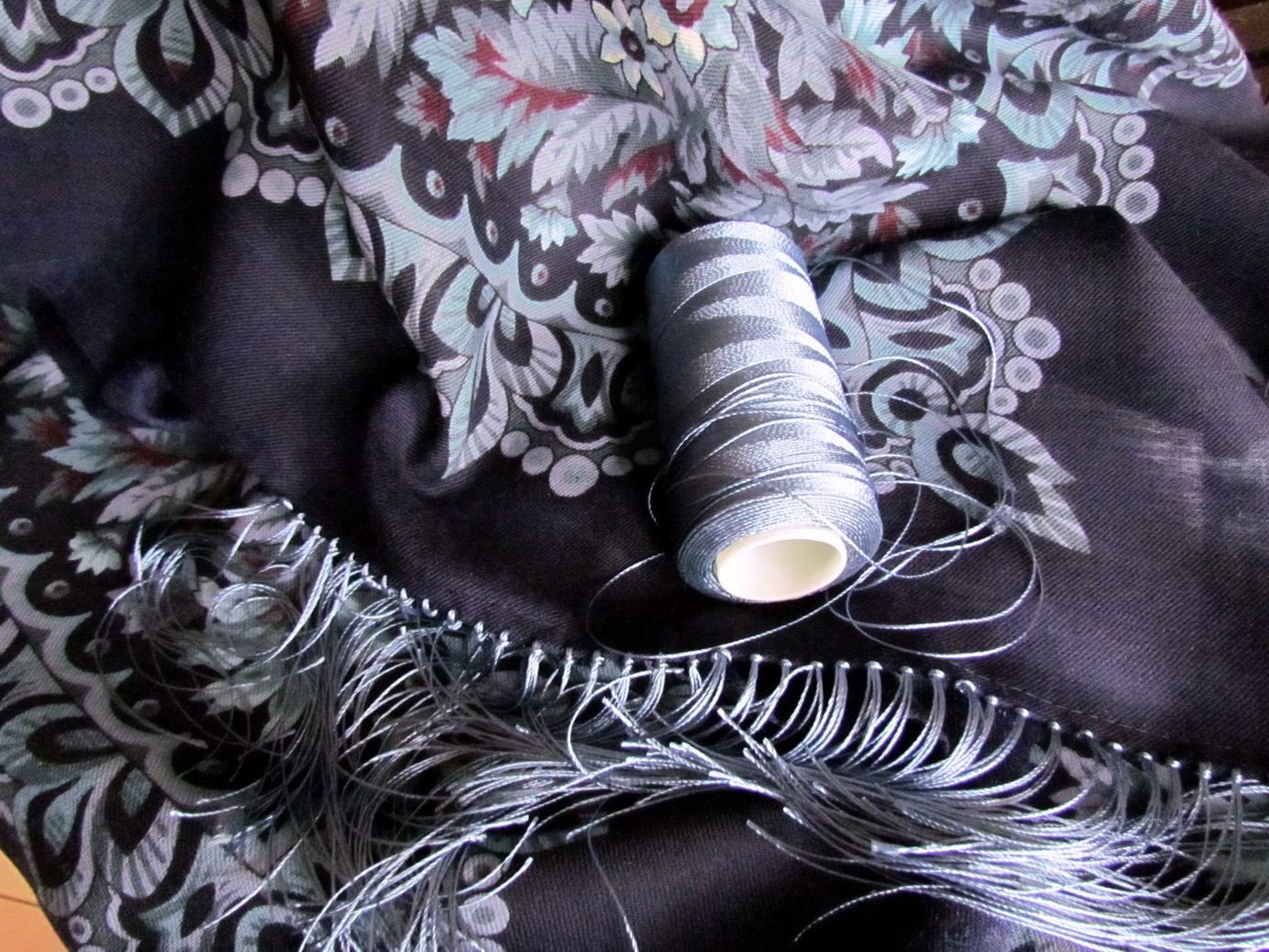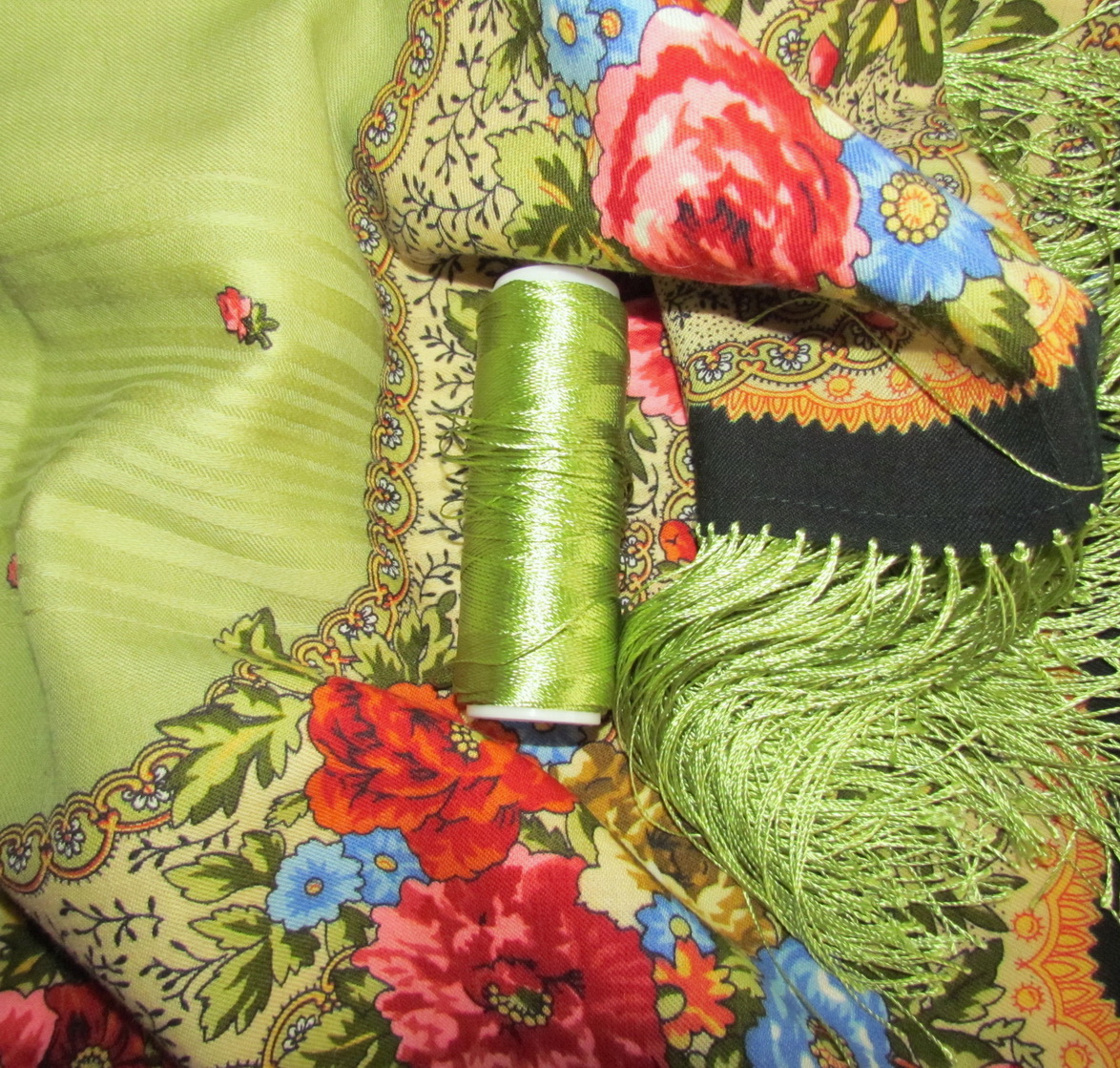 Я всё-таки удалила бахрому на красной Любаве и подшила платок "американкой" - своей прелести он не потерял, а для меня - приобрёл. Стал более пластичным. С шерстяной бахромой могу "выдержать" платки размером 125x125, не больше. К тому же ширина каймы с разных сторон отличалась на 2-3 сантиметра и я её уравняла до 4,5 см в готовом виде.