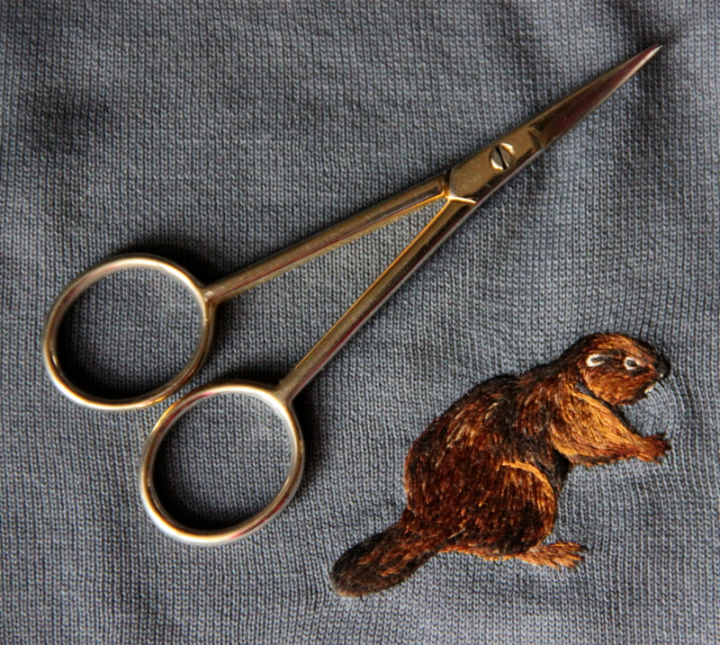 Мне понадобилось замаскировать дырку на трикотажном джемпере. Вышился миниатюрный бобёр (нитки шёлк №65).