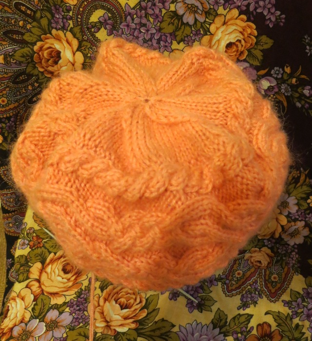 Впервые поперечный аран, а потом к нему привязались нижний ободок из 80 петель и верхушка, начиналась с 96. Потом поделилась на 6 частей и сначала убавляла по две в каждом ряду, потом- по три.