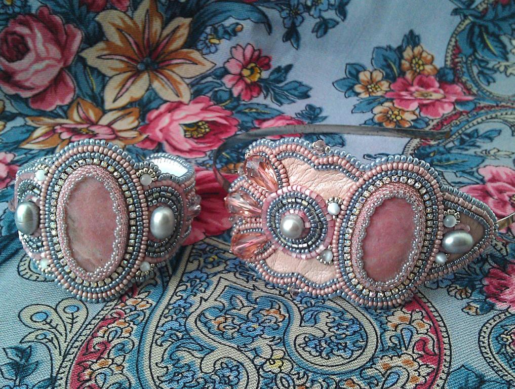 А в браслете и ободке для волос, использован редкого окраса родонит - полностью розовый. Родонит, считается женским камнем.