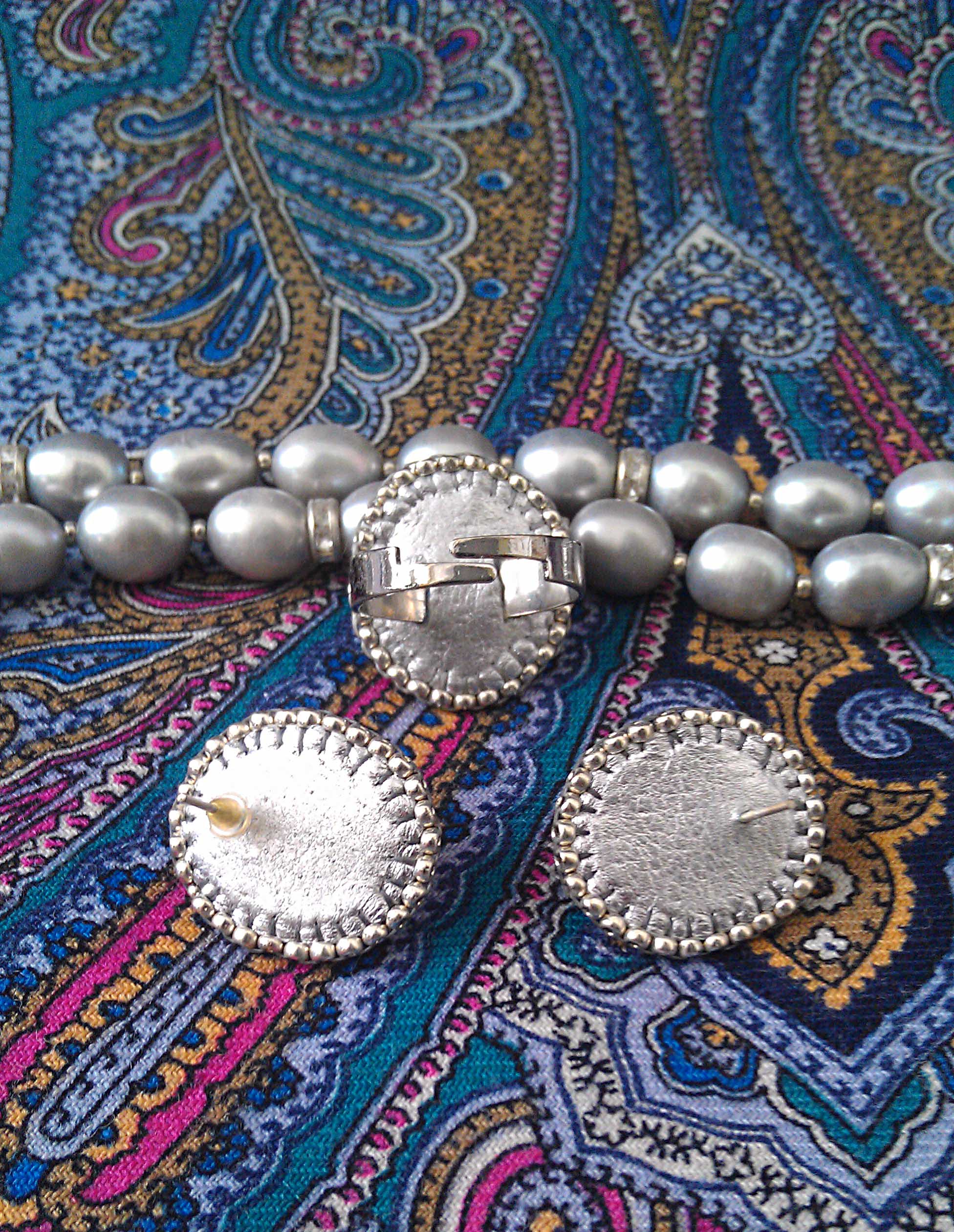Этот комплект я ношу с Драгоценной 2, серой Чеканкой, синим Караваном, да серый жемчуг вообще ко многим шалям подходит.