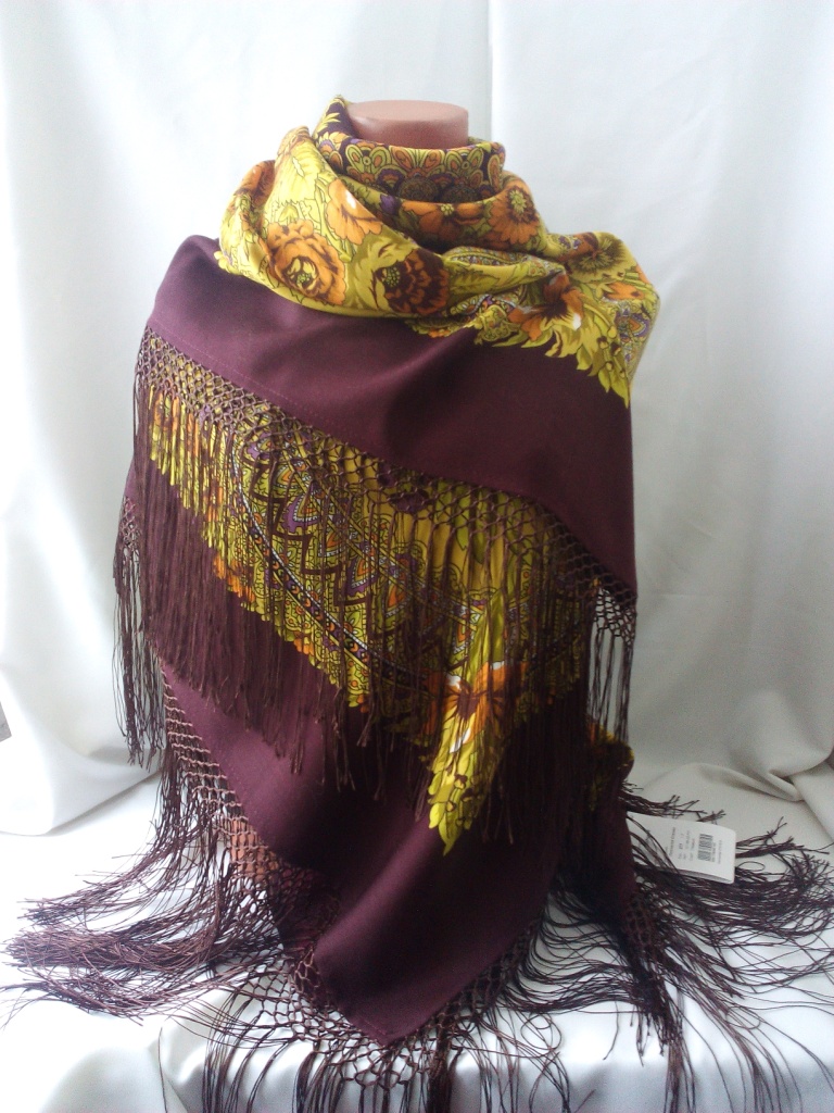 Елена, на ОМ очень интересное сочетание получилось, видимо, потому что цвет бахромы перекликается с коричневыми оттенками в рисунке шали.