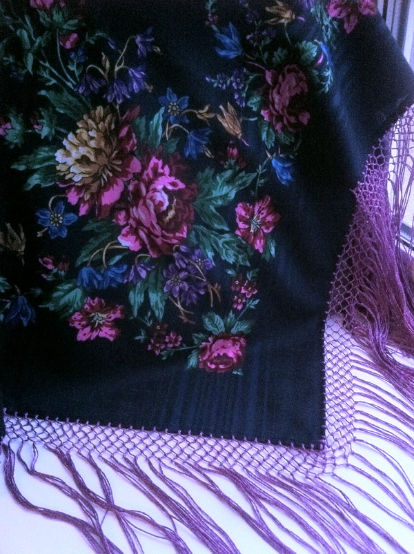 А я зависла с Ситцевым краем, с черной каймой. Уже было почти решила из него пошить сарафан или юбку, но потом дрогнула и подумала - есть же, что носить, пусть пока шалью побудет. Но без бахромы он не смотрится. Купила нитки, вяжу бахрому, но что-то опять не то.