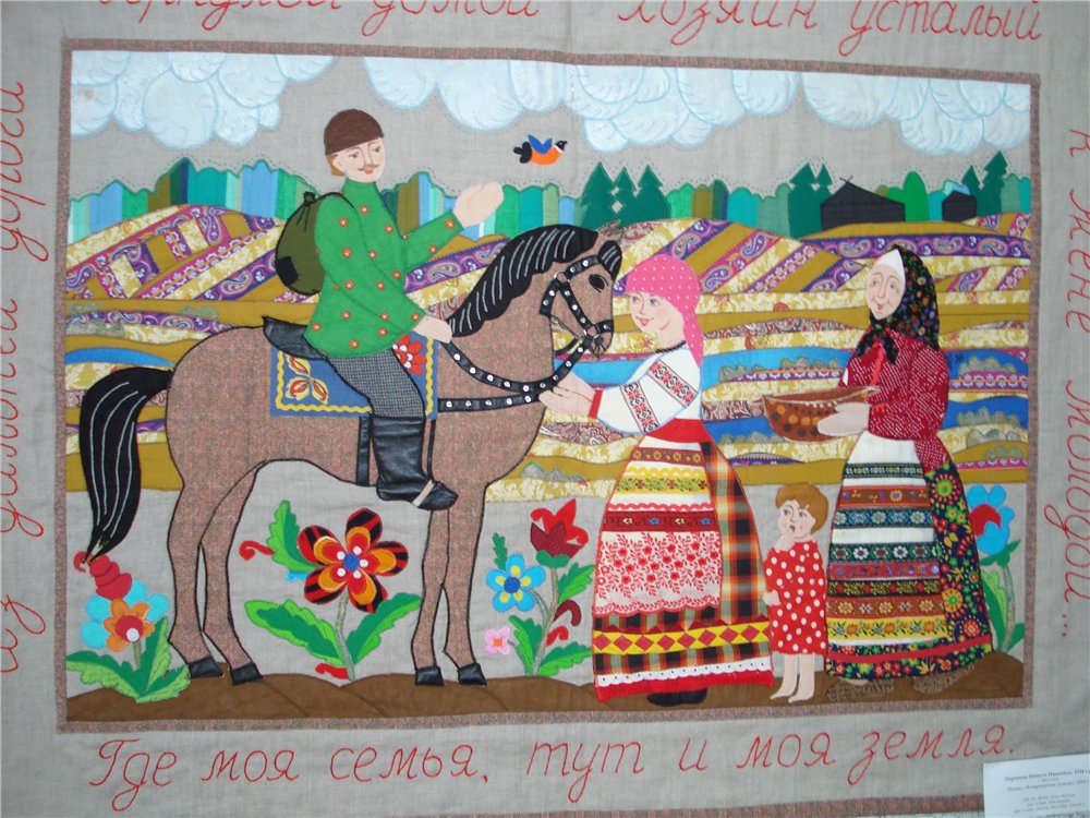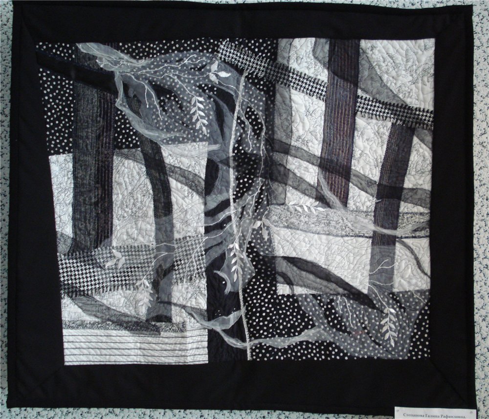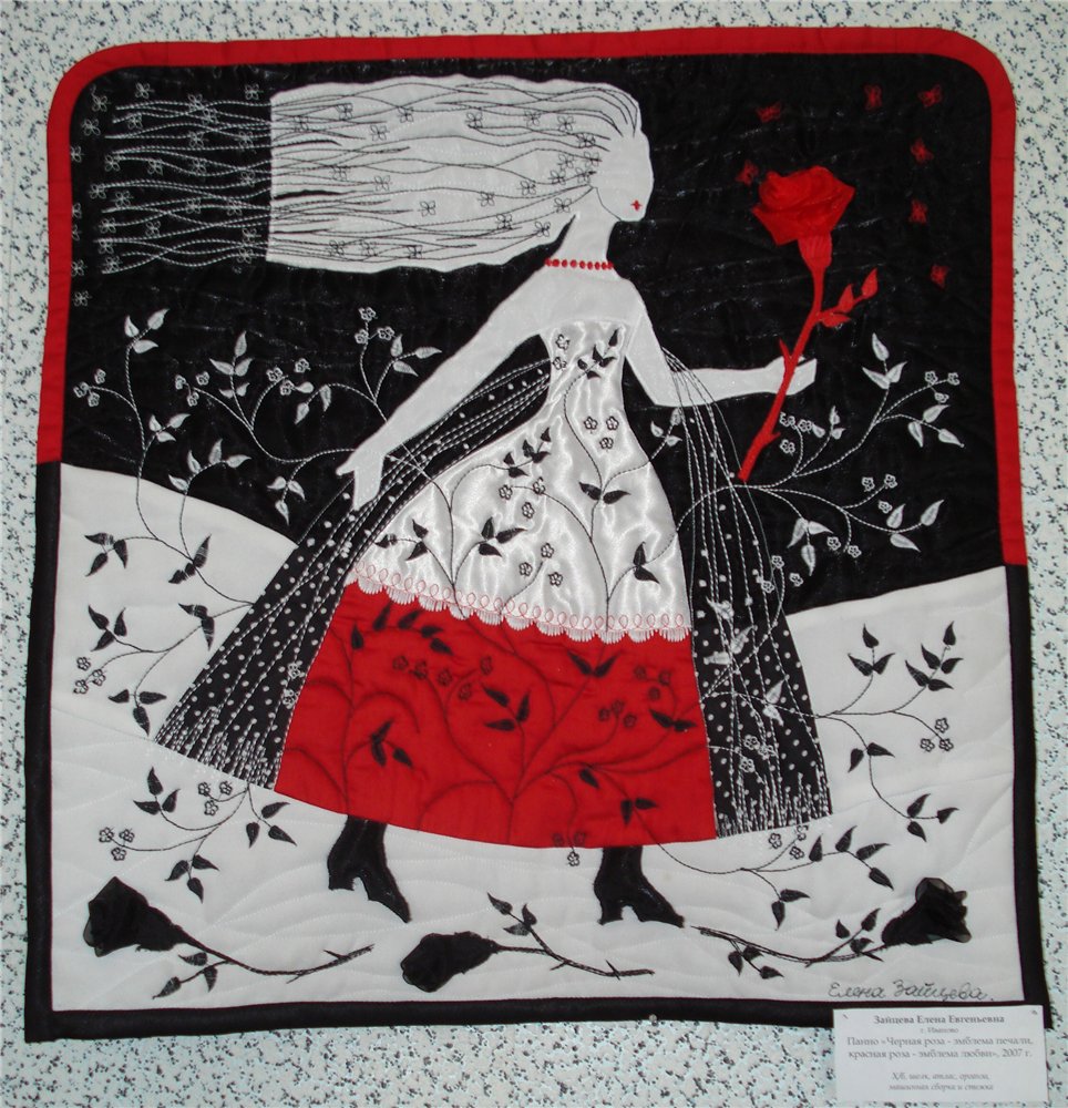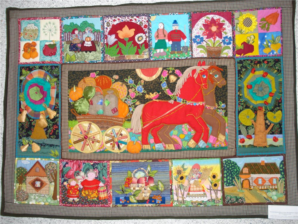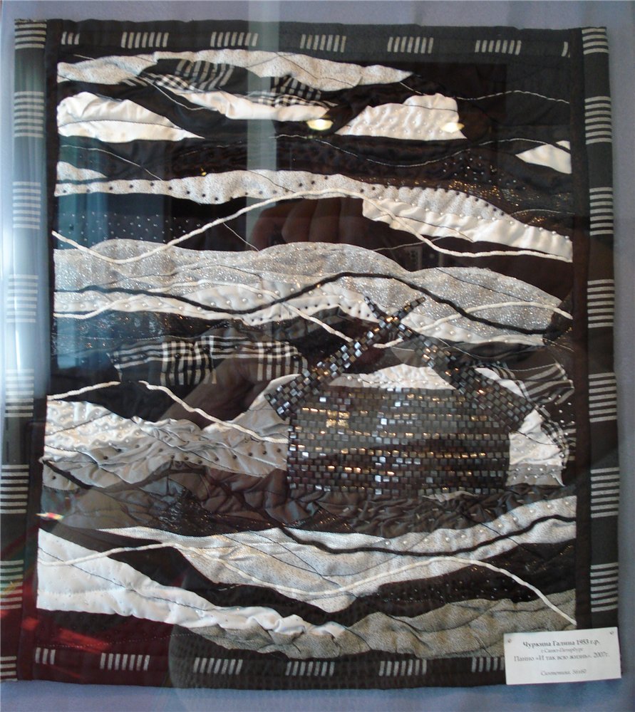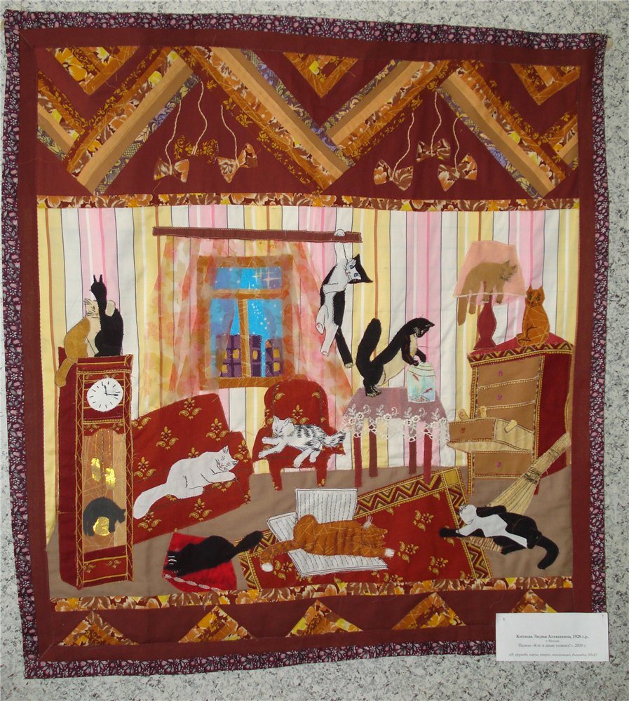 Экспозиция предоставлена Всероссийским домом народного творчества, около 60 работ, разделены тематически: черно-белые узоры, быт, времена года и ещё что-то. Как стало развиваться лоскутное мастерство доподлинно неизвестно, существует несколько версий. По одной из них эту технику освоили ещё в 980 году до нашей эры, по другой- оно родилось в 14 веке в Англии, по третьей в 17 веке в Англии же крестьяне стали шить из лоскутов т.к., шить из ткани было для них дороговато, ещё версия – впервые стали использовать американские переселенцы опять же по причине бедности, и это далеко не все версии.